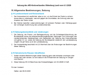 „«afd-oldenburg-land.de» lädt/lud ein PDF-Dokument «Satzung des AfD-Kreisverbandes Oldenburg Land vom 6.3.2020» zum AfD-Kreisparteitag in der Gemeinde Hatten am 06.03.2020 hoch. In dem PDF-Dokument «Satzung des AfD-Kreisverbandes Oldenburg Land vom 6.3.2020» steht/stand: „1. Der Kreisvorstand führt die laufenden Geschäfte des Kreisverbandes. 2. Der Kreisvorstand besteht aus: a. dem Kreisvorsitzenden, b. zwei stellvertretenden Vorsitzenden, c. dem Kreisschatzmeister, d. dem stellvertretenden Kreisschatzmeister e. dem Schriftführer, f. dem stellvertretenden Schriftführer g.und mindestens zwei Beisitzern. Über die Anzahl der Beisitzer entscheidet der Kreisparteitag.“.“ Quelle: lkolpatriotinnen