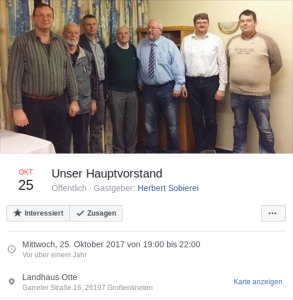 Der 2016 gewählte Ortsverbandvorstand für den Landkreis Oldenburg; Treffpunkt: Landhaus Otte. Von links nach rechts: Andreas Lozano Fernandez, Heinrich Rykena, Harm Rykena, Manfred Kupfer, Herbert Sobierei, Christian Sturm und Dierk Horstmann. Bildquelle: Screenshot Facebook