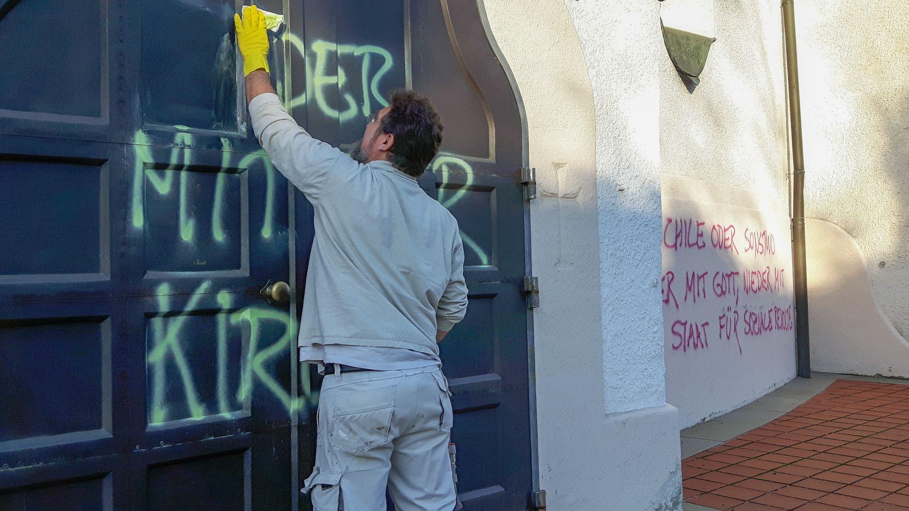 Großes Entsetzen herrscht in drei Münchner Kirchengemeinden: Unbekannte haben die Eingangsbereiche von vier Kirchen großflächig mit Hassbotschaften besprüht. Jetzt hofft die Polizei auf Hinweise aus der Bevölkerung auf die Sprayer.