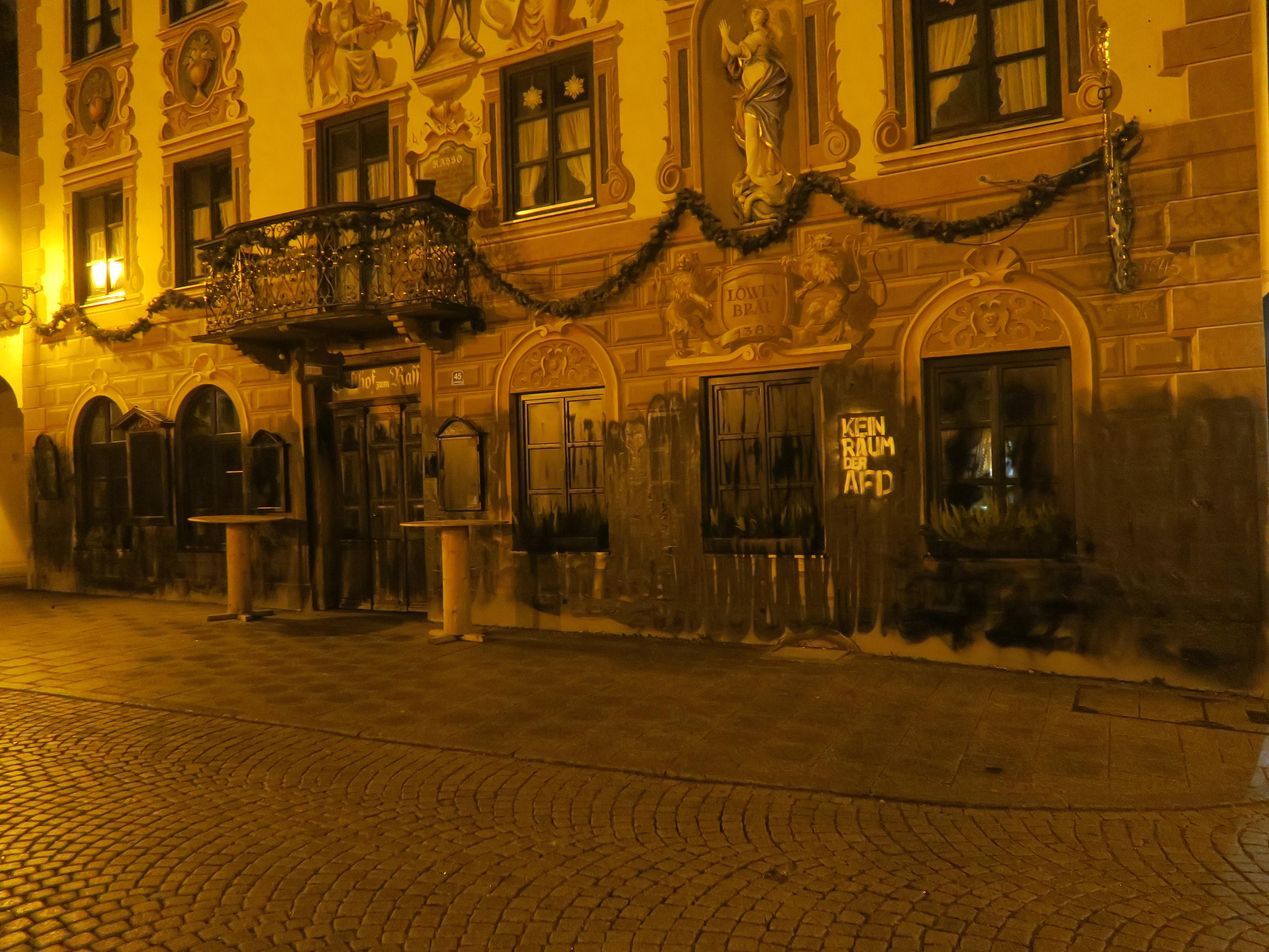 Wir haben in der Nacht vom 12. auf den 13. März die Fassade des Gasthofes „Zum Rassen“ in verschönert. Die Aktion findet wie viele weitere in ganz Bayern unter dem Motto „Den Rechten entgegentreten“ statt. Mit Sprühdosen wurde die komplette Fassade, die Fenster und Tür schwarz bemalt. Um klar zu machen worum es uns geht, haben wir auch noch den Schriftzug „Kein Raum der AfD“ angebracht, weil im Gasthof der lokale Stammtisch der AfD stattfindet und dort auch immer wieder VertreterInnen des faschistischen „Flügels“ innerhalb der AfD sprechen durften.