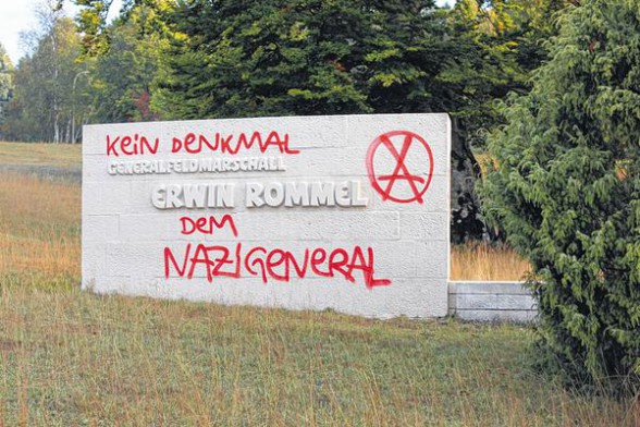 Neu ist der Spruch „Kein Denkmal dem Nazi-General“ nicht, denn seit Jahren prangen immer wieder Schriftzüge auf dem höchst umstrittenen Rommel-Denkmal. Bei der Stadtverwaltung hat man nach den neuesten Schmierereien sofort gehandelt und einen heimischen Steinmetz mit der Entfernung der Graffiti beauftragt.