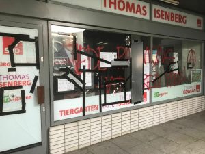was spd berlin (in sommerpause) und die bullen heute nicht gemeldet haben sind die kaputten und mit der parole „jede räumung hat ihen preis“ versehenen scheiben des spd büros von thomas isenberg in der einkaufspassage am hansaplatz, berlin-tiergarten.