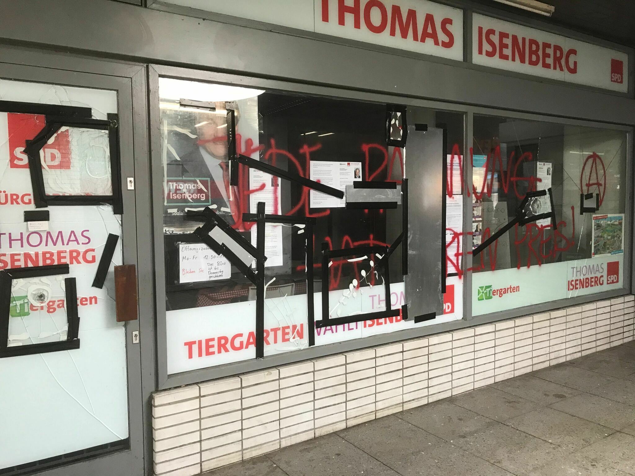 Unbekannte haben das Wahlkreisbüro des gesundheitspolitischen Sprechers der SPD im Berliner Abgeordnetenhaus, Thomas Isenberg, demoliert und mit Graffiti verunstaltet.