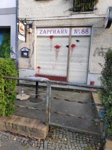 In wenigen Tagen will die NS-Partei „Der III. Weg“ durch Hohenschönhausen marschieren und kräftig die Werbetrommel rühren. Sie hoffen in Berlin auch Leute von der schwächelnden NPD abzuwerben. Grund genug, dieser Zielgruppe zu zeigen, dass sie unter besonderer Beobachtung steht. Gesagt getan, gingen einige Antifas zur NPD Kneipe „Zapfhahn88“ in der Konrad-Wolf-Straße. Die Rolläden waren kein Hindernis und ließen das Werkzeug auf die Glasscheiben treffen. Farbgläser rundeten das ganze ab.