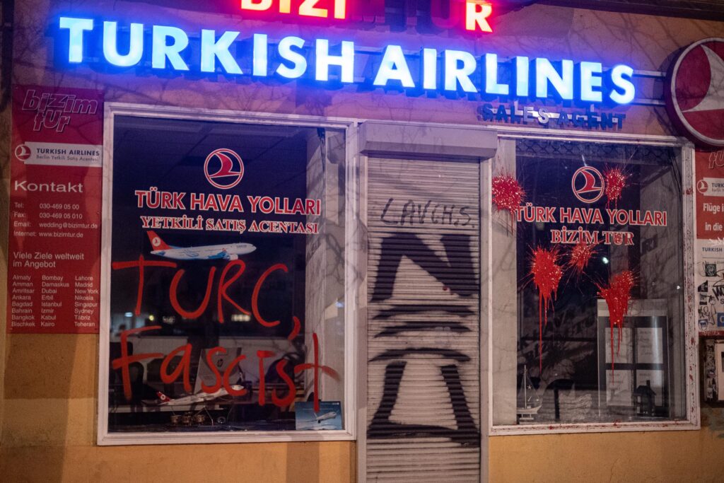 Vor einigen Nächten haben wir eines von zahlreichen Turkish Airlines Büros in Berlin mit einigen Farbbomben und einem neuen Schriftzug verschönert. Turkish Airlines unterstützt durch ihre Einnahmen direkt die türkische Regierung und den Faschisten Erdogan, welcher mit den dadurch gewonnen Geldern einen brutalen Krieg gegen die Bevölkerung von Nord-Ost Syrien/Rojava führt. Erdogan lässt gezielt die zivile Infrastruktur, wie zum Beispiel Kraftwerke und Getreidesilos bombardieren. Immer wieder ermorden türkische Drohnen auf offener Straße Menschen, insbesondere Frauen, welche sich für die Selbstverwaltung einsetzen. Seit dem 4. Oktober hageln türkische Bomben auf Rojava nieder, finanziert unter anderem durch den Tourismus in der Türkei und Turkish Airlines. Doch ihnen wird es nicht gelingen, die Revolution zu zerschlagen!