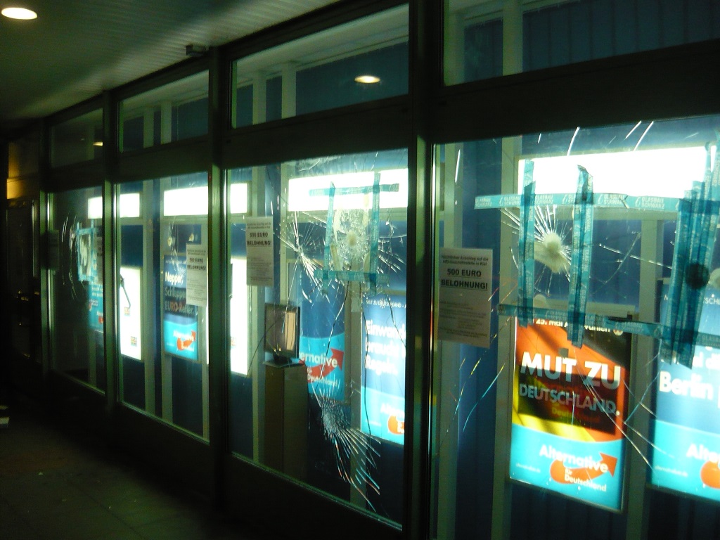 Als Verursacher sieht die AfD rund 80 Linksradikale, die bei einer spontanen Kundgebung gegen die Räumung und für den Erhalt der Luftschlossfabrik in Flensburg die Parteizentrale angriffen. Matthias Arends, Pressesprecher der Polizei in Kiel, hingegen beschwichtigt: „Aus der Gruppe von nur rund 50 Demonstranten ist eine Flasche in Richtung der Parteizentrale geflogen und hat dort in der Tat eine Scheibe beschädigt.“ Von einem Angriff auf das Gebäude könne jedoch keine Rede sein. Die Anzeige sei aufgenommen worden, ein Täter konnte jedoch bislang nicht ermittelt werden, sagt Arends. Die Polizei habe die Demonstration von Beginn an begleitet.