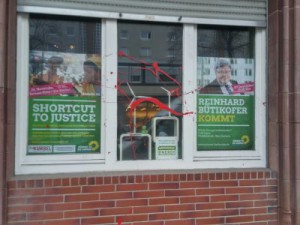 Aktivist*innen haben in der Nacht auf Mittwoch, den 21.12.16 die Büros der Landtagsabgeordneten Alexander Salomon und Bettina Lisbach farblich markiert. Dies war eine Reaktion auf die nun stattfindenen Sammelabschiebungen von Geflüchteten nach Afghanistan. Diese Abschiebungen sind unerträglich, denn sie bedeuten, dass diese Menschen in einem Land voller Krieg und Terror landen, wo ihr Leben auf dem Spiel steht. Afghanistan ist keinesfall sicher, wie behauptet wird, sondern mit dieser Politik wird der Tod Unschuldiger billigend in Kauf genommen. Die grün-schwarze Landesregierung macht bei dieser unmenschlichen Politik der Großen Koalition fleißig mit und freut sich über steigende Abschiebungen. Die beiden grünen Landtagsabgeordneten aus Karlsruhe, Lisbach und Salomon, stimmen diesem Kurs zu.