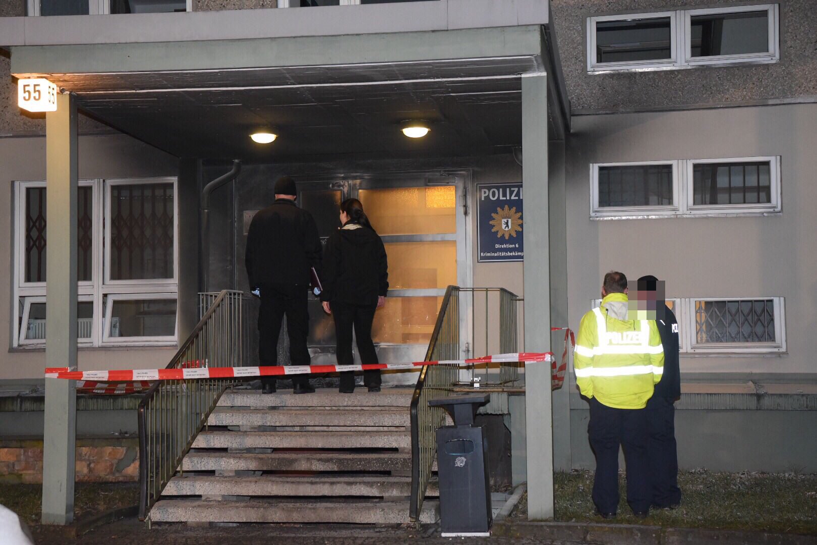 Consideramos esta reunión un insulto y pensamos: “Estos cerdos… esto no debería ser, ¡NO!” Igual de insultante es la cumbre del G-20 que tendrá lugar en verano en Hamburgo. Les defensores de lo existente y aquelles responsables de la miseria prevaleciente no se han ganado una plataforma. Por este motivo conspiramos contra el sistema de fronteras y control, y atacamos el edificio policial de la Kriminalpolizei (agencia de investigación criminal) en Directorate 6 con dos juegos de incendiarios y un neumático.