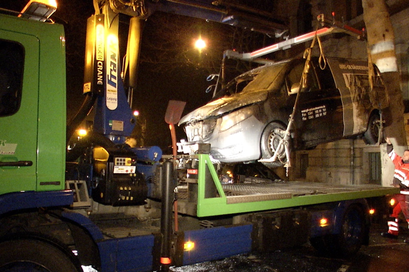 The car, reportedly pushed into the street, was parked beside another car when the incendiary device was ignited. It’s not the first time a car starts to move a bit after going up in flames. And it’s all the more gratifying when it interferes with the fire fighting operations and thereby adding to the damage.