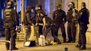 Nachdem ein Mann festgenommen worden war, weil er einen Polizisten beleidigt und versucht hatte, ihm gegen den Kopf zu schlagen, solidarisierten sich die Menschen an der Kreuzung. 20 zum Teil vermummte Personen pöbelten und warfen Steine und Pyrotechnik, rannten dann „in ein Haus“. Die 65 Polizisten konnten den Einsatz erst gegen 4.40 Uhr beenden. Auch ein Polizeihubschrauber war im Einsatz und leuchtete die Kreuzung aus. Die kaputte Straße wurde mit einer Warnbake abgesperrt.