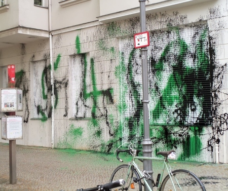 In un’azione notturna filmata fu attaccato ampiamente con la vernice il management di quartiere in via Schillerpromenade. Su sfondo nero la scritta verde “F54” e un cuore. Il fatto spuntava poi in un video di mobilitazione per la settimana d’azione dove si possono vedere anche altre azioni grafitare e di tappezzeria. Su Facebook il management informava che il 20 aprile non poteva aprire causa vapori da solvente. Il post definisce lx attaccanti di pseudo sinistra ma non è troppo chiaro chi vorrebbero offendere.