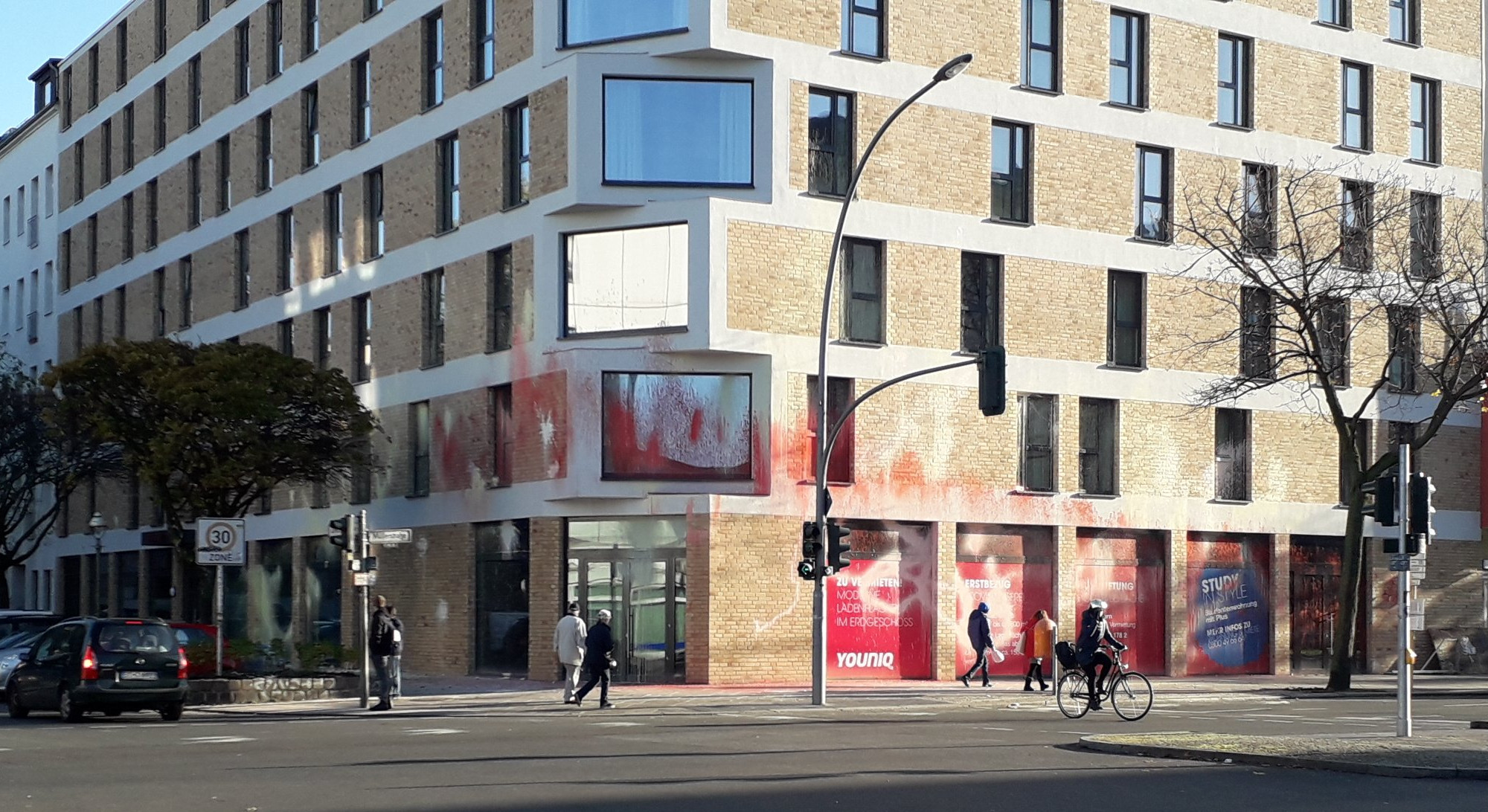 Unbekannte haben ein Studentenwohnheim in Berlin-Wedding mit Farbbeuteln beworfen und dabei Autos beschädigt.