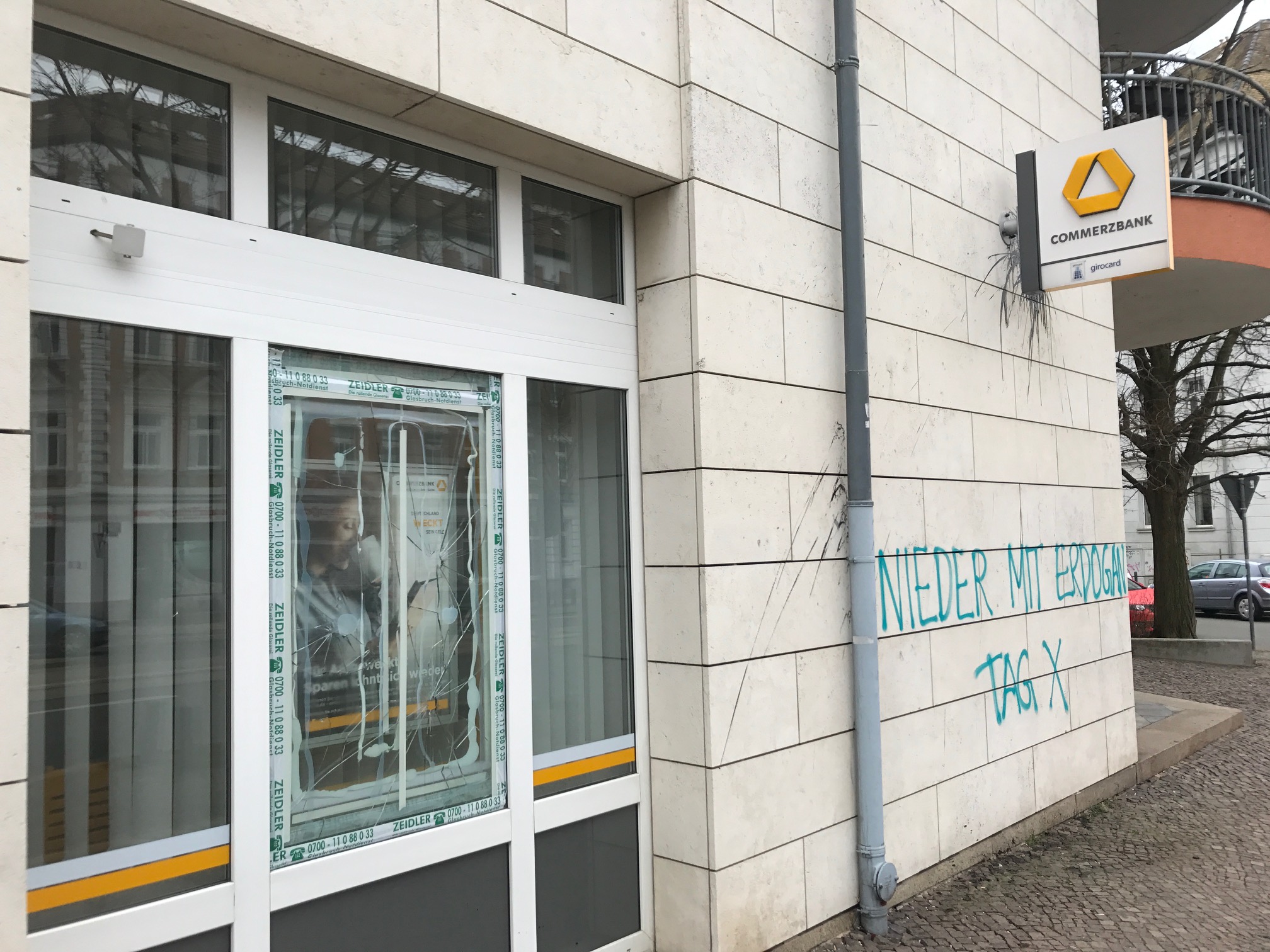 Inspiriert von den Anschlägen der vergangenen Woche (1) traf es in der vergangenen Nacht die Commerzbank in der Landsberger Straße. Wir haben die Scheiben bearbeitet und Farbe an der Fassade hinterlassen. Zum Kontext sei auf das Schreiben der Genoss*innen (1) verwiesen.