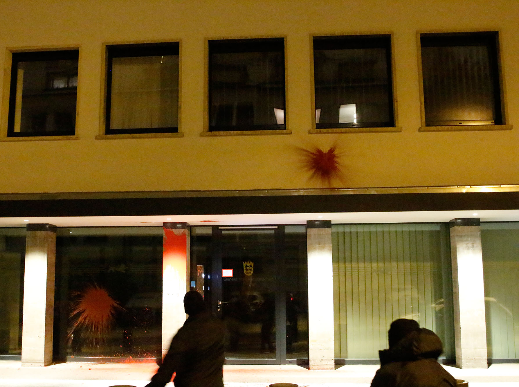 …und zwar mit Farbkugeln und -flaschen.Doch was ist die Generalstaatsanwaltschaft und warum ist sie Ziel unseres symbolischen Angriffs geworden? Die Generalstaatsanwaltschaft steht für staatliche Repression. Sie ist die höchste Instanz staatlicher Verfolgung und direkt dem Innenministerium unterstellt. Damit ist sie u.a. verantwortlich für die Verfolgung kurdischer AktivistInnen. Aber nicht nur diese sind von staatlicher Repression betroffen. Alle Menschen die sich gegen das kapitalistische System oder seine Auswüchse wehren und sich für fortschrittliche Alternativen einsetzen, sollen abgeschreckt und von ihrem Kampf abgehalten werden. Polizeigewalt, Geldstrafen, Bewährung und Knast, sind Mittel zur Verteidigung des kapitalistischen Systems und werden in Stuttgart – ganz im Gegensatz zur schwäbischen Natur – alles andere als sparsam verhängt.