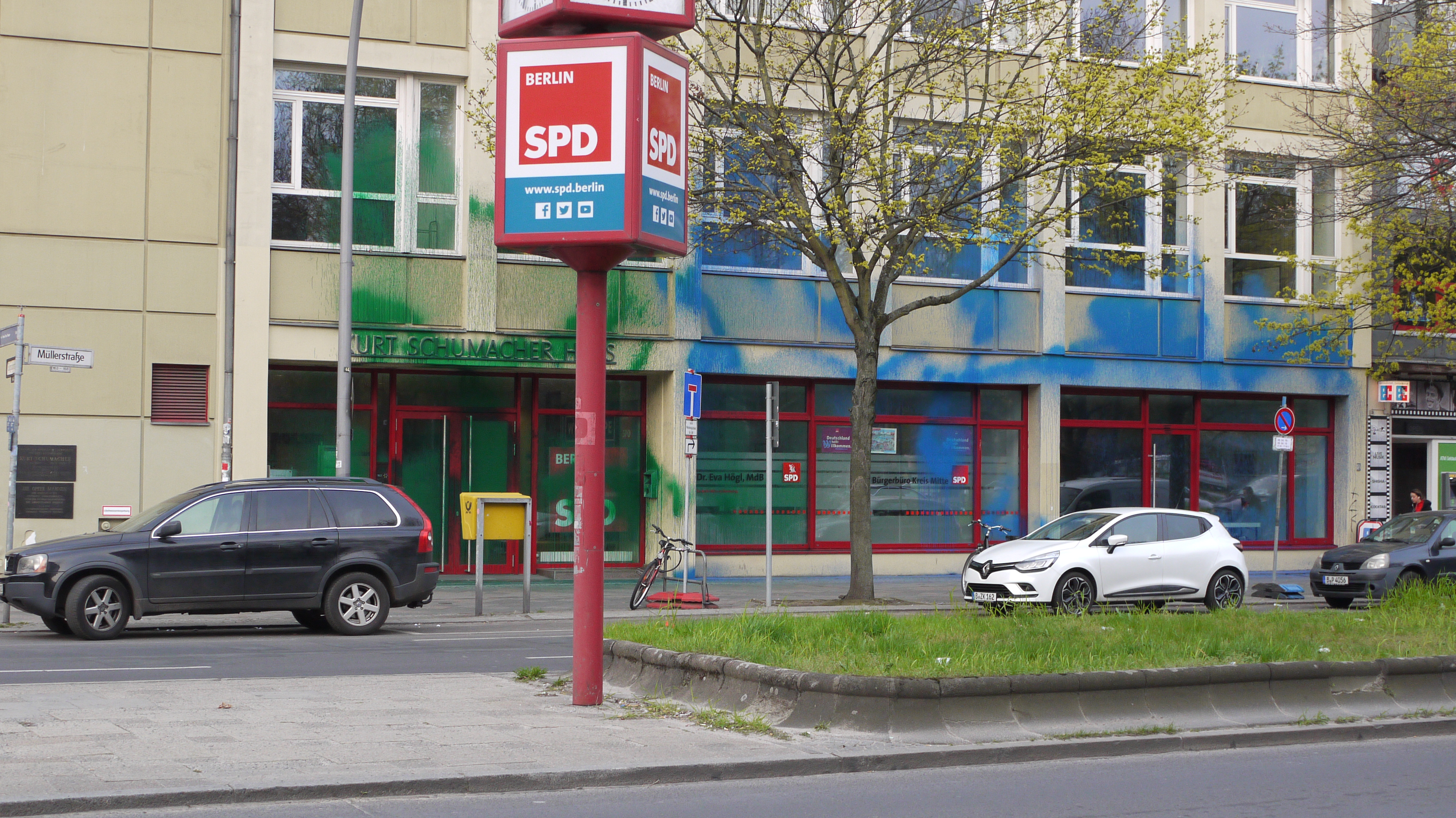 Und nicht nur das, es ist eine Partei, die die Verantwortung an dem Tod unzähliger Menschen trägt durch ihre Zustimmung an Waffenexporten, Mitgestaltung und Sicherung der Mauern Europas, Hartz4, heraus zögern der Energiewende, Kriegseinsätze (z.B. Afganhistan/Kundus), etc.Aus diesen Gründen haben wir uns in der Nacht auf den 03.04. aufgemacht um das SPD-Büro (Willy-Brandt-Haus) in der Müller Str. im Wedding farblich umzugestalten und ein paar mal feste an ihre Scheibe zu klopfen in der Hoffnung, dass sie genauso zerbricht, wie irgendwann diese Partei, welche uns durch den Verrat an uns allen, die sich Sorgen machen wo sie morgen wohnen, keine andere Wahl laesst als zu handeln.