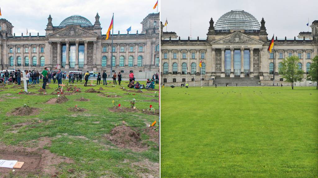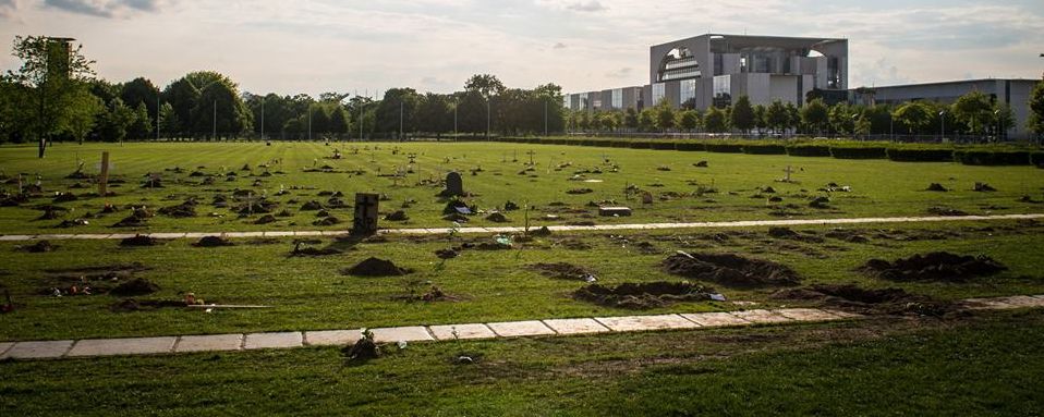 91 Festnahmen, zwölf verletzte Polizisten und mehr als 100 Löcher in der Reichstagswiese – das ist die Bilanz der Flüchtlings-Demo “Die Toten kommen” im Regierungsviertel. Am Sonntag waren 5.200 Demonstranten einem Aufruf des Aktivistengruppe “Zentrum für Politische Schönheit” gefolgt, stürmten die Reichstagswiese und legten dort symbolische Gräber für im Mittelmeer ertrunkene Flüchtlinge an.