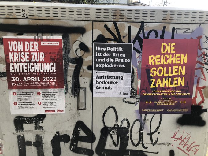 Rund um den 1. Mai gibt es viele wichtige Termine. Los geht es am 30. April um 15 Uhr im Wedding am Elise-und-Otto-Hampel-Platz, U-Bhf. Leopoldplatz (vor dem Jobcenter) mit der Demonstration Von der Krise zur Enteignung! Die Reichen sollen zahlen! Am Abend um 20 Uhr findet ab Mauerpark (Eingang Bernauer Str.) die feministische FLINTA-only-Demo gegen Sexismus und patriarchale Gewalt unter dem Motto „Take back the Night“ statt.