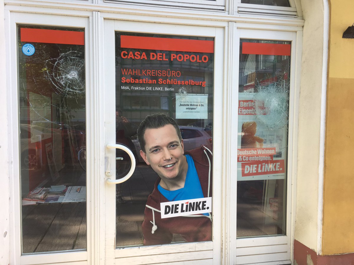 Am späten Samstag Abend des 4. Mai haben wir das Büro von Sebastian Schlüsselburg, Mitglied des Berliner Ausschusses für Verfassungsschutz und Abgeordneter der Partei „Die Linke“ im Bezirk Berlin-Lichtenberg, mit Steinen angegriffen. Die meisten Fenster wurden zerstört. (…) Nennen wir zuerst die Abstimmung im Bezirk Lichtenberg für den Bauplan des sinnlosen Aquaparks in der Rummelsburger Bucht, ein weiteres Projekt für die Stadt der Reichen und Tourist*innen. Der Bebauungsplan führt zu der Räumung von Obdachlosen, die ein kleines Gebiet in der Bucht mit ihren Zelten besetzt haben. (weiterlesen: Chronik Blog / Englisch )