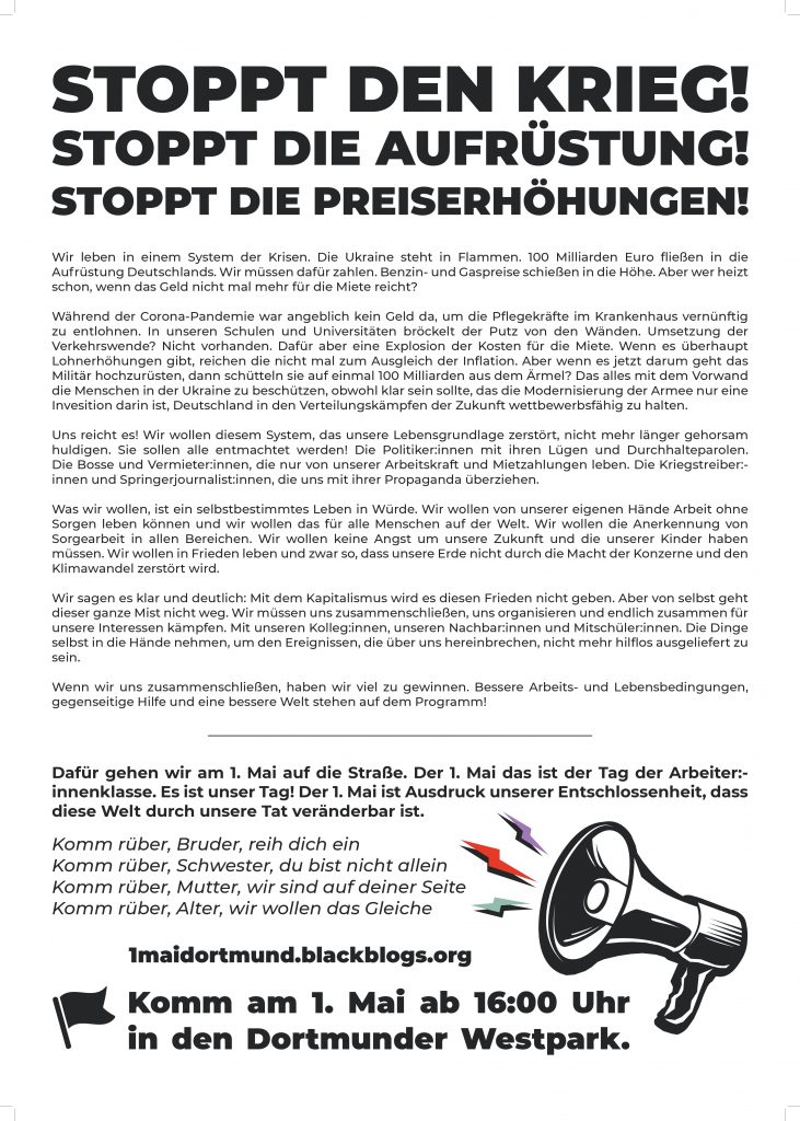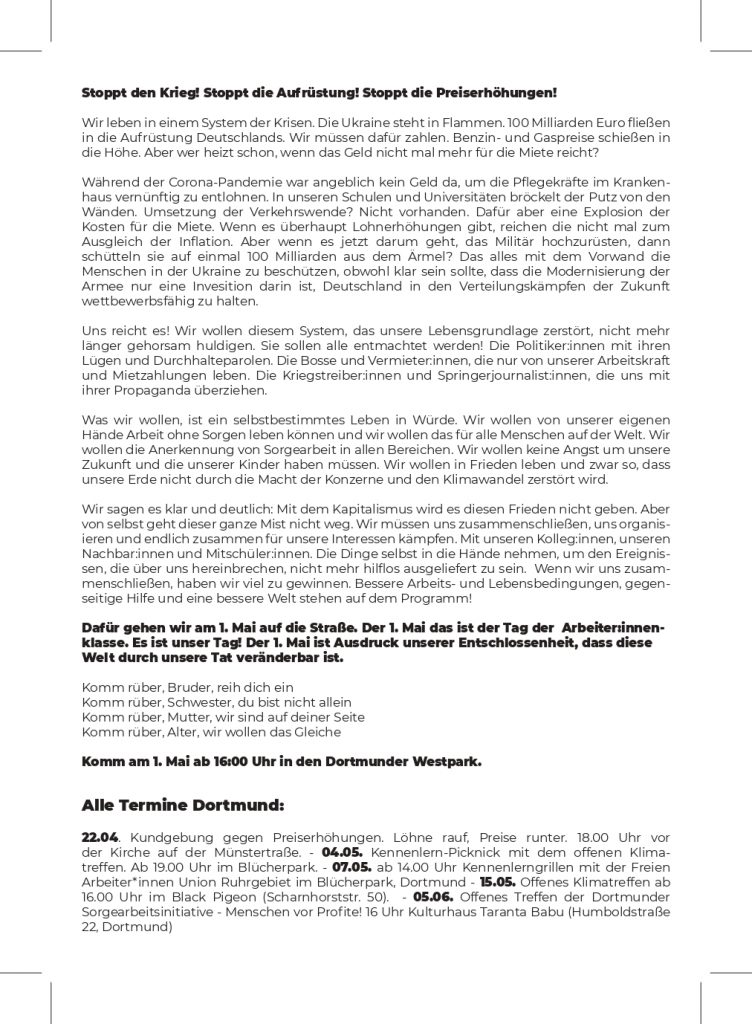 Materialien Falls du bei dem Verteilen mitwirken möchtest, melde Dich gerne unter: [email protected] Oder hol dir direkt Material im anarchistischen Zentrum, Black Pigeon, Scharnhorststr. 50 in Dortmund ab. Plakate Aufkleber Flyer