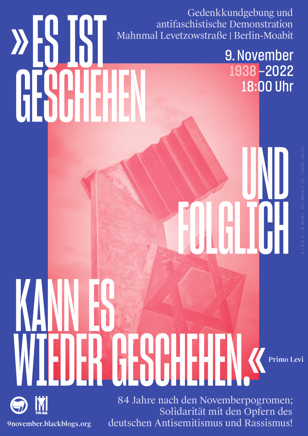 Wie schon in den vergangenen Jahren rufen wir als antifaschistisches Bündnis für den 9. November 2022 um 18.00 Uhr in Gedenken an die Novemberpogrome von 1938 zu einer Kundgebung vor dem Mahnmal Levetzowstraße sowie zu einer anschließenden Demonstration durch Berlin-Moabit auf. Wir rufen auf zu einem heute weiterhin notwendigen antifaschistischen Gedenken, das an diesem Ort bereits seit mehreren Jahrzehnten Tradition hat. Im Jahr 1990 organisierte das Antifaschistische Aktionsbündnis Moabit die erste Gedenkveranstaltung zu den Novemberpogromen mit rund 60 Teilnehmer*innen. Seit 1990 überschatteten die Feierlichkeiten zum Mauerfall das Gedenken an die nationalsozialistischen Pogrome. Das antifaschistische Gedenken in Moabit richtete sich daher von Anfang an sowohl explizit gegen den erinnerungspolitischen Konsens der BRD als auch gegen den wieder spürbar anwachsenden deutschen Nationalismus. Damals war das Gedenken an die Novemberpogrome kaum verbreitet in der Linken und erst Recht nicht beim Rest der deutschen Gesellschaft. Es fand bis zu diesem Zeitpunkt hauptsächlich in den jüdischen Gemeinden statt. Gleichzeitig war mit den Republikanern eine extrem rechte Partei in Fraktionsstärke Teil der Berliner Bezirksverordnetenversammlungen und Neonazi-Parteien, wie die FAP, waren aktiv auf den Straßen. Auch als Antwort auf die rassistischen Pogrome und Brandanschläge in den 1990er Jahren, wie in Hoyerswerda und Rostock-Lichtenhagen, gab es nur eine Konsequenz: Gedenken muss antifaschistisch sein. Ein Gedenken, das zugleich laut sowie kämpferisch und den Opfern des Nationalsozialismus gewidmet ist. Nicht zuletzt war das Gedenken selbst Ziel von Angriffen, wie der Bombenanschlag auf das Deportations-Denkmal auf der Putlitzbrücke 1992 zeigte.