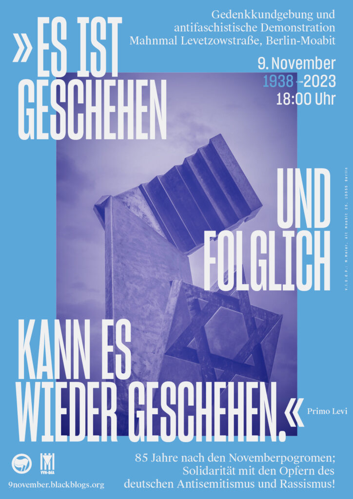 Als antifaschistisches Bündnis rufen wir am 9. November 2023, dem 85. Jahrestag der Novemberpogrome, zu einer Gedenkkundgebung am Mahnmal Levetzowstraße mit anschließender kraftvoller, antifaschistischer Demo durch Moabit auf.