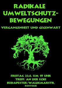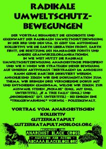 Am Freitag, den 22.06. laden wir und das Anarchistische Kollektiv „Glitzerkatapult“ zu einem interaktiven Vortrag mit Filmchen rund um das Thema Radikale Umweltschutzbewegungen ein. Kommt rum, es wird spannend! Wir treffen uns um 19 Uhr an der Ecke Budapester/Waldemarstr., um dann gemeinsam zu einem gemütlichen Ort in der Nähe zu gehen.