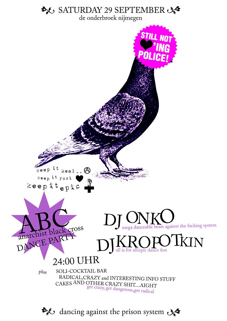 Zaterdag 29 September zal er in de Onderbroek een Anarchist Black Cross danceparty plaats gaan vinden. Dj Onko en Dj Kropotkin zullen je verschillende onweerstaanbare beats brengen waarvan je gegarandeerd knikkende knieën zult krijgen.