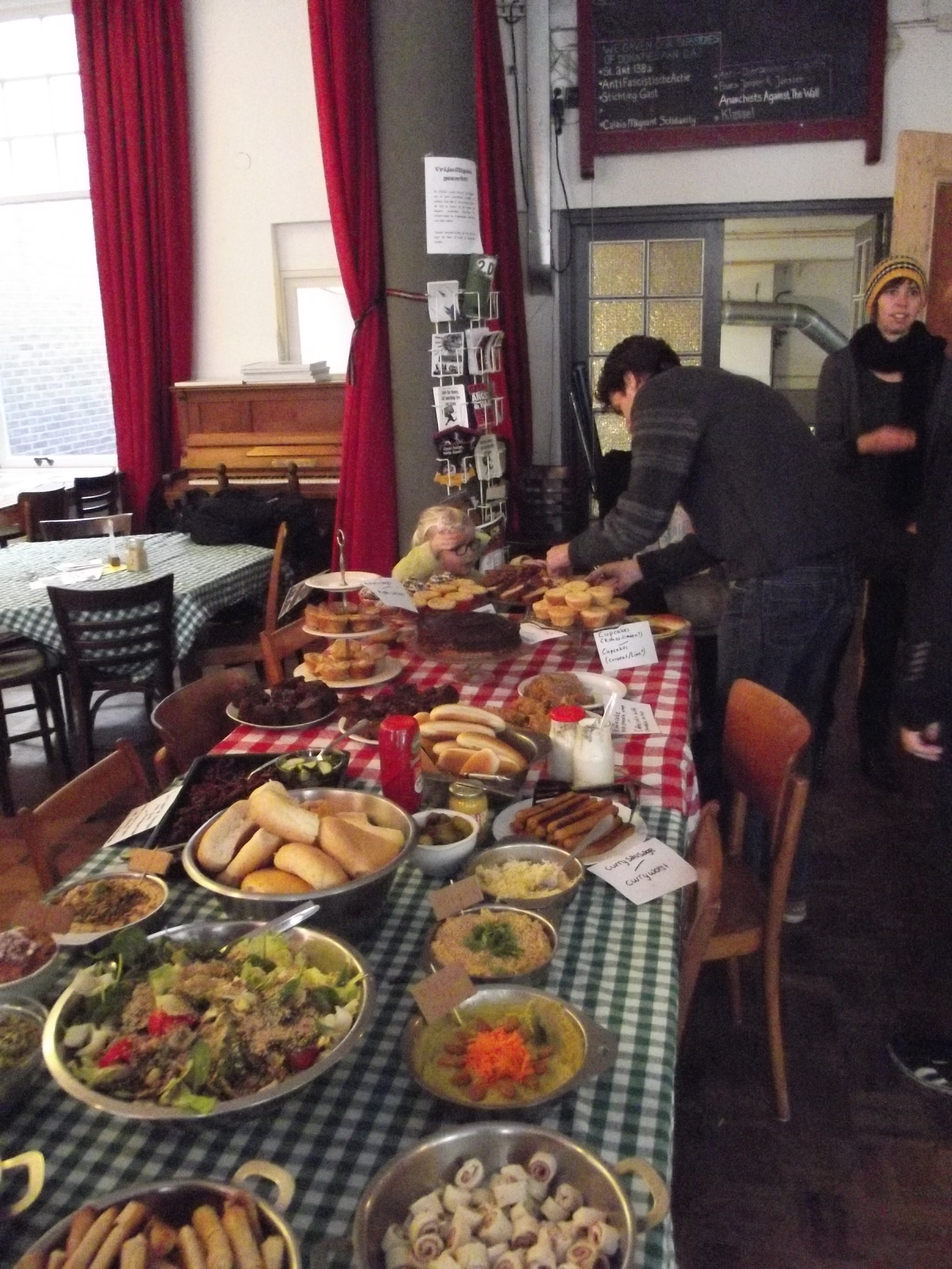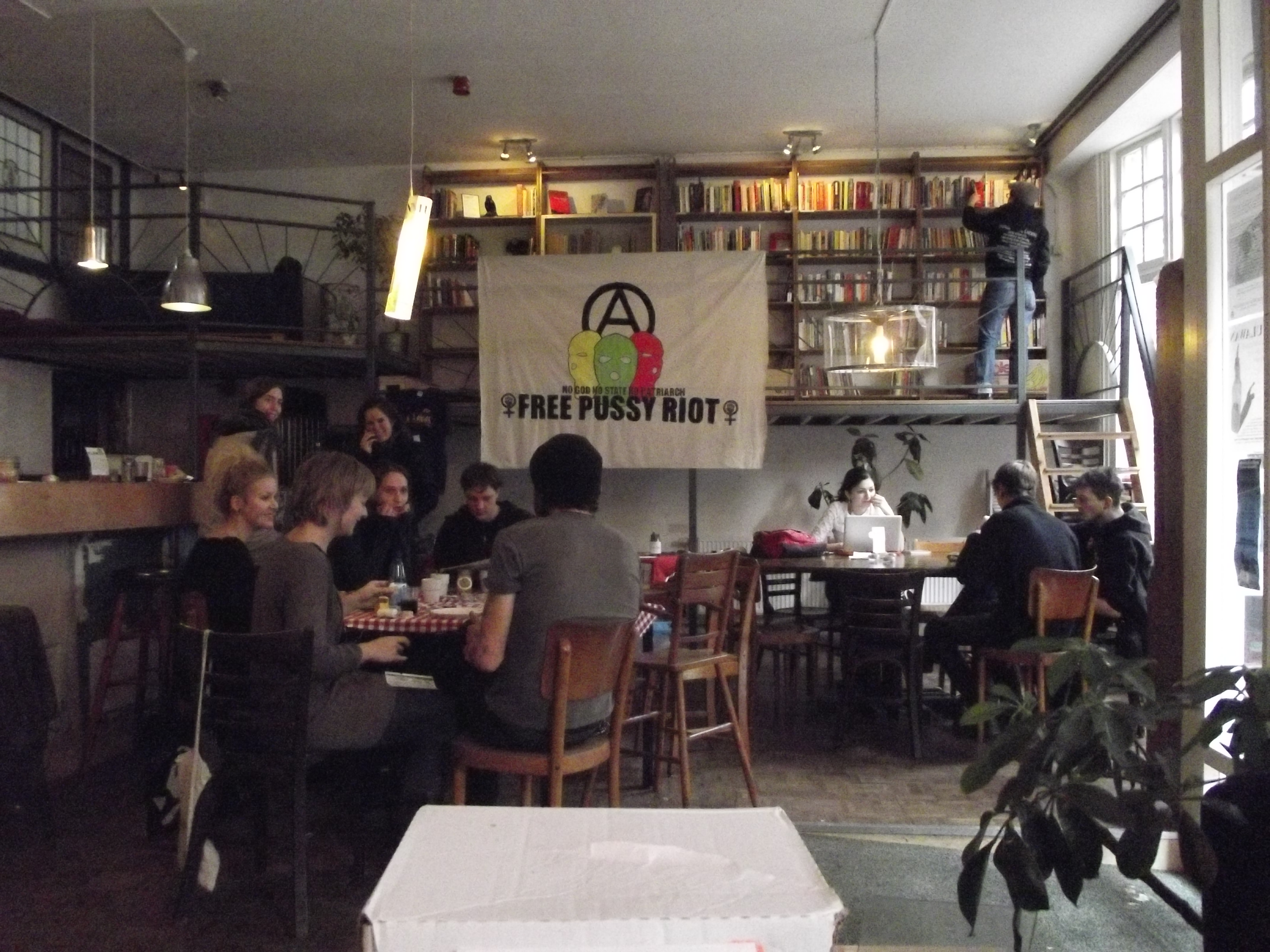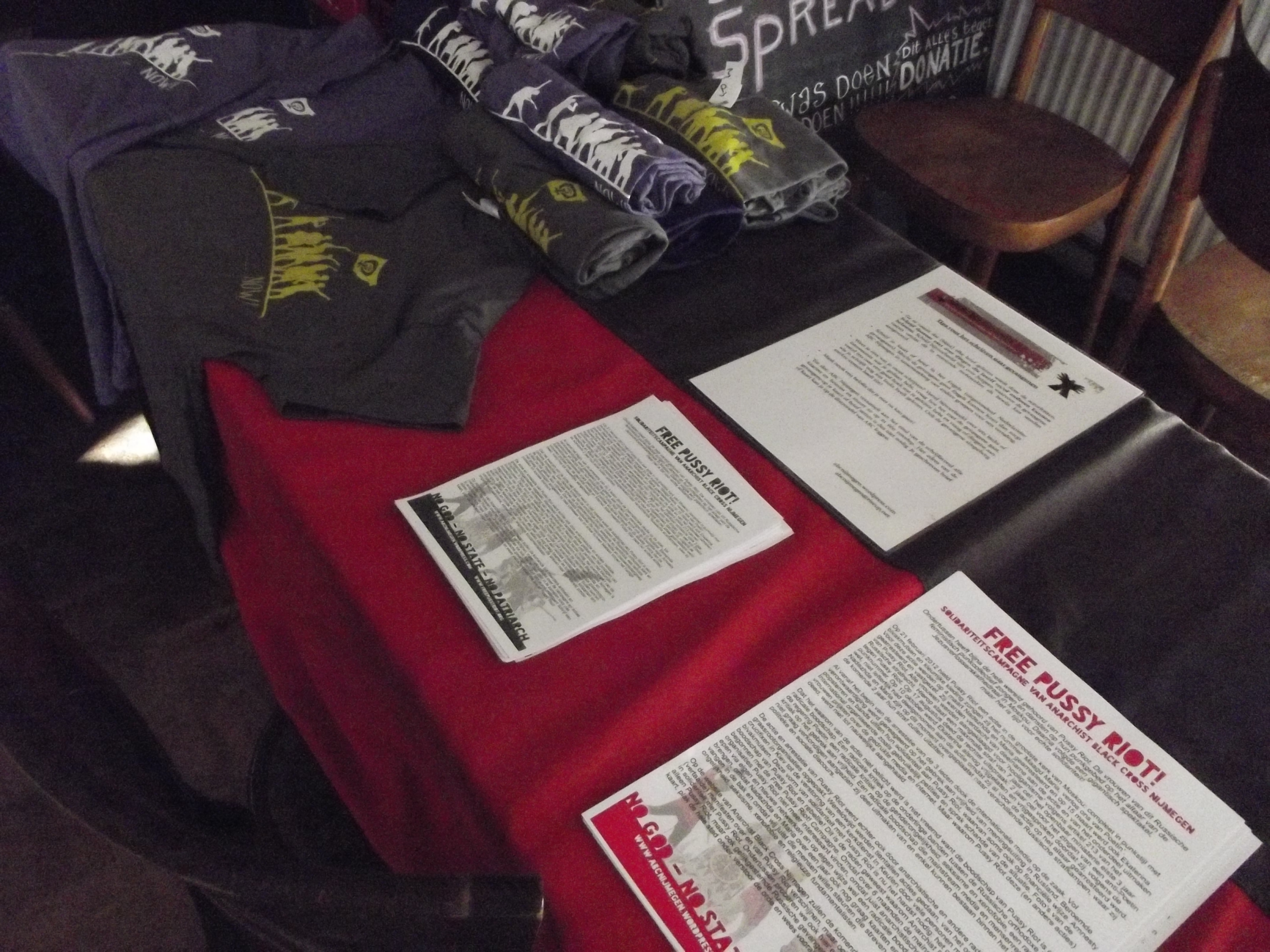 Anarchist Black Cross Nijmegen in de Klinker met een heerlijke veganistische benefiet brunch. Helaas waren de posters en stickers van de campagne niet op tijd geleverd, maar deze worden de aankomende dagen verwacht. Gelukkig was er een overdaad aan muffins, seitanworsten, taarten en broodjes tempeh. Met de brunch is een redelijk bedrag opgehaald. Waar gaat dit geld naar toe? In overleg met de Free Pussy Riot solidariteitsgroep uit Rusland is besloten het geld van onze campagne te sturen naar verschillende Russische anarchistische gevangenen, dus zowel naar Maria en Nadezhda van Pussy Riot alsmede andere gevangenen die streven naar een wereld voor gelijkheid en solidariteit. De reden hiervoor is dat Pussy Riot op dit moment beschikt over een groot netwerk van (financiële) steun terwijl dit netwerk bij andere Russische anarchistische gevangenen stukken kleiner is.