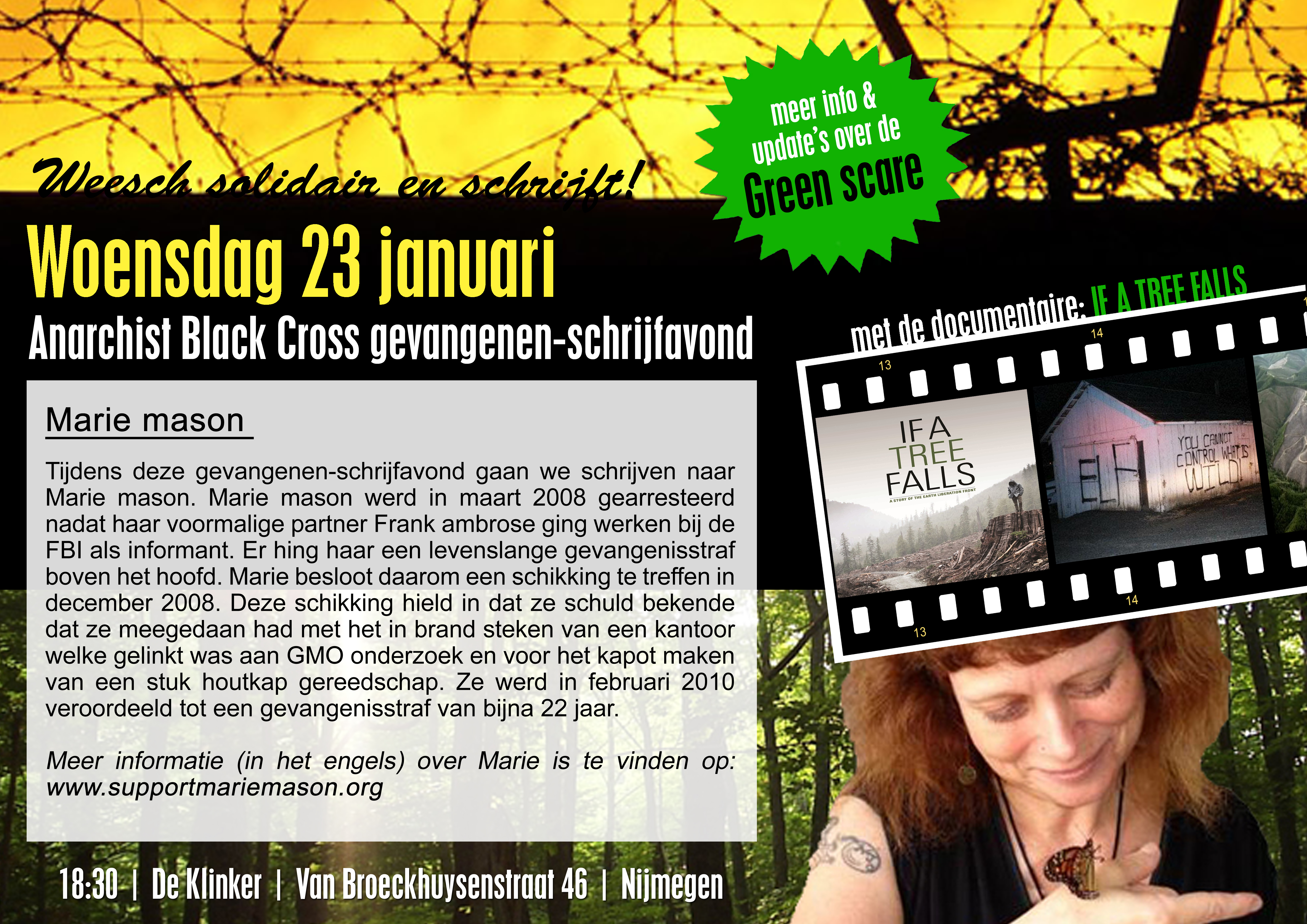 Tijdens deze gevangenen-schrijfavond gaan we schrijven naar Marie Mason. Marie Mason werd in maart 2008 gearresteerd nadat haar voormalige partner Frank Ambrose ging werken bij de FBI als informant. Er hing haar een levenslange gevangenisstraf boven het hoofd. Marie besloot daarom een schikking te treffen in december 2008. Deze schikking hield in dat ze schuld bekende dat ze meegedaan had met het in brand steken van een kantoor welke gelinkt was aan GMO onderzoek en voor het kapot maken van een stuk houtkap gereedschap. Ze werd in februari 2010 veroordeeld tot een gevangenisstraf van bijna 22 jaar.