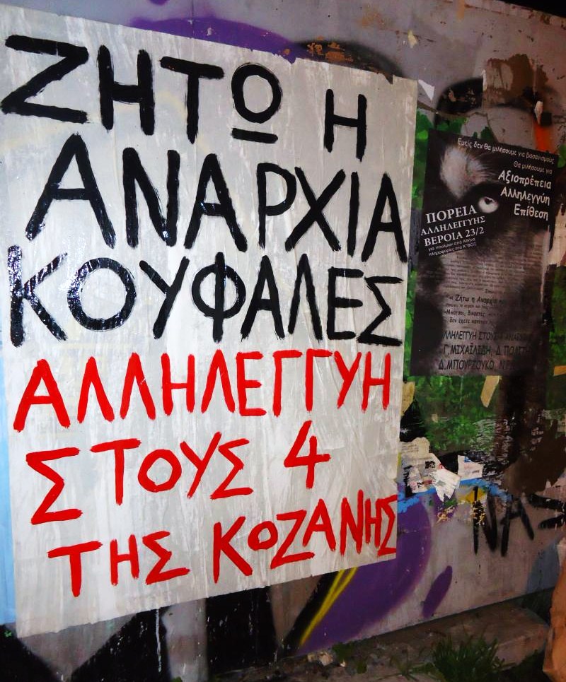 solidarity-action-maroussi_athensOp vrijdag 1 februari werden vier anarchisten opgepakt na een lange achtervolging in Griekenland. Ze worden verdacht van een dubbele overval, op een bank en een postkantoor. Voor twee van de gearresteerden stond al een arrestatiebevel uit voor veronderstelde participatie in de ‘Conspiracy of Cells of Fire’.