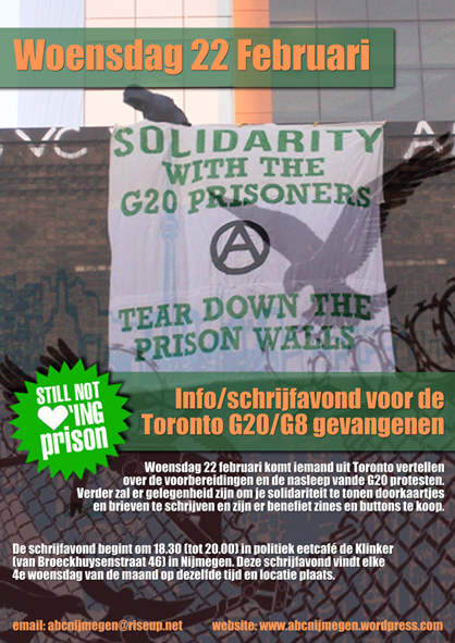 Woensdag 22 februari komt iemand uit Toronto vertelen over de voorbereidingen en de nasleep van de G20 protesten. Verder zal er gelegenheid zijn om je solidairiteit te tonen door kaartjes en brieven te schrijven naar G20 arrestanten en er zijn benefiet zines en buttons te koop.