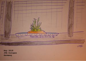 Carrot on the Window Sill. Drawing. 5/18Note 23/5/18: For a few weeks (not long after I got here actually) I have had a little plant growing in an old plastic jam pot full of toilet paper (I’m not allowed dirt inside apparently). I am going to give that little plant, who is doing very well in the the toilet paper to my surprise and because its clear I watch the roots snake around the sides, to a friend who likes plants too. So, a few days ago when I received a rare carrot during lunch, I decided to keep the top and put them in a lid of water. They seem happy, in two days they have sprouted new leaves and the old ones are a few centimeters taller. Both plants I think are enjoying the warm weather, though it is a little chilly today. I did also try and grow tomato seeds, which went well until it was cold for a few days. I’ll try again though when I get another tomato, I really like watching them grow, its super uplifting. I really miss gardening!