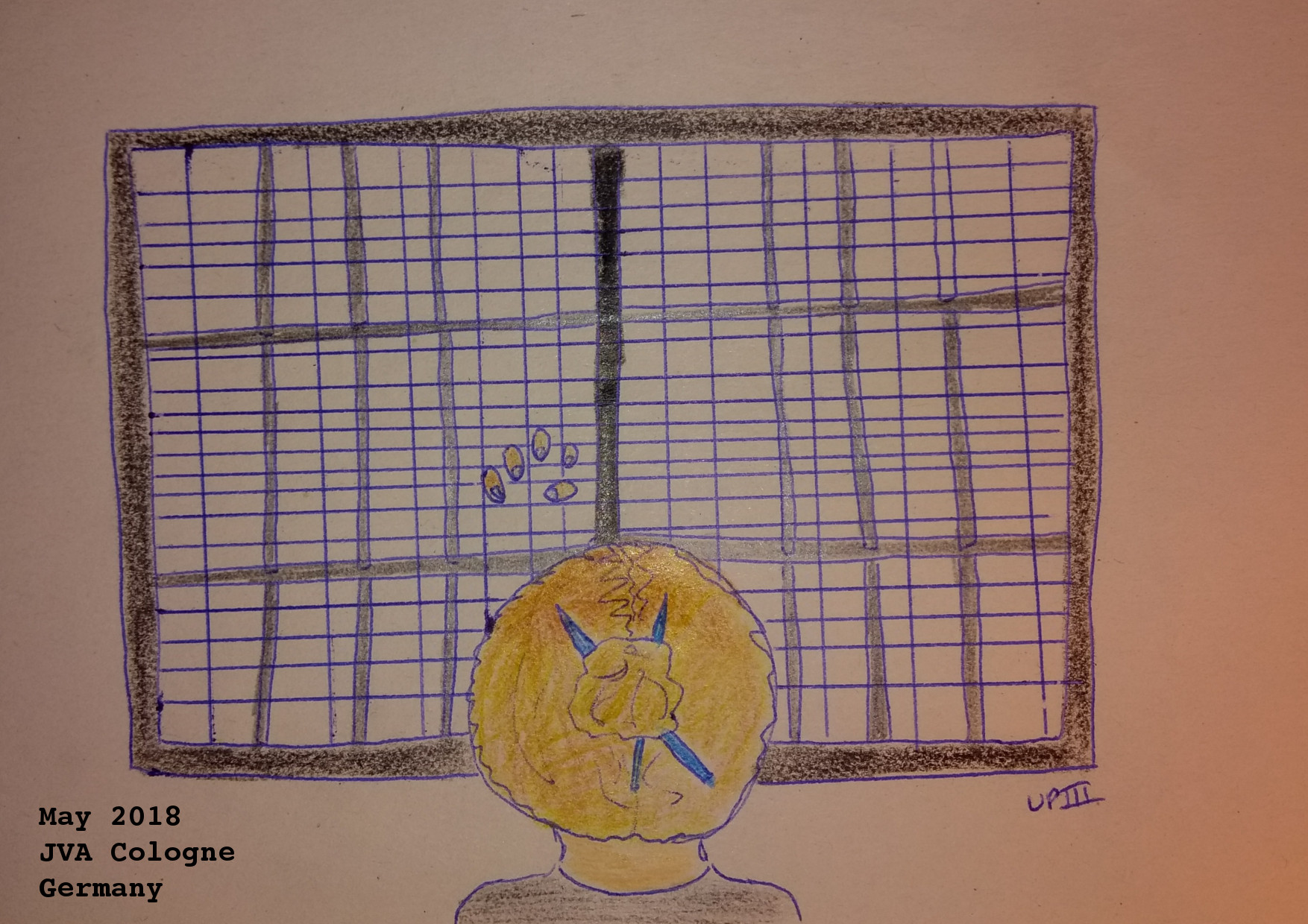 Conversation through the Bars. Drawing. 24/5/18TRIGGER WARNING Note 24/5/18: Today, during Freistunde (“free hour”) outside, I spoke to a friend through their window as they didn’t want to come out and be around everyone outside (fair enough). They tell me they are struggling. We talk about psychologists, other mental health workers. They’ve been doing hard drugs and now are clean because of prison, they have to deal with their issues. They refuse to accept they are in prison. They tell me there is only a small chance they will survive here without me. They cry, tell me when I go it will be goodbye, I will never see them again. They want me to tell their friends they love them, that they are sorry. I don’t know what to say, how to help, can I tell anyone about this? I did, and I feel like I betrayed them. This is the worst I’ve felt so far. I’m not sure what to do, they are upset with me, I feel lost. I wonder, did I do the right thing? I’m not sure.
