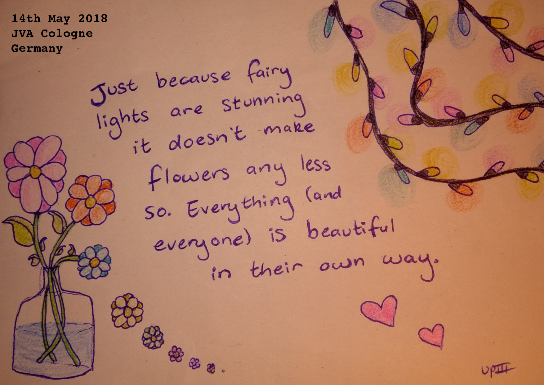 Fairy Lights and Flowers. Drawing. 14/5/18Note 23/5/18: Hey there friends! In case you’re having a not so good day, this is for you. I really like drawing “positivity shit” as I recall someone calling it. My friends here like it too. Stay strong, I miss and I love all of you. Best wishes and energy, hopefully I can come home soon. <3 UPIII