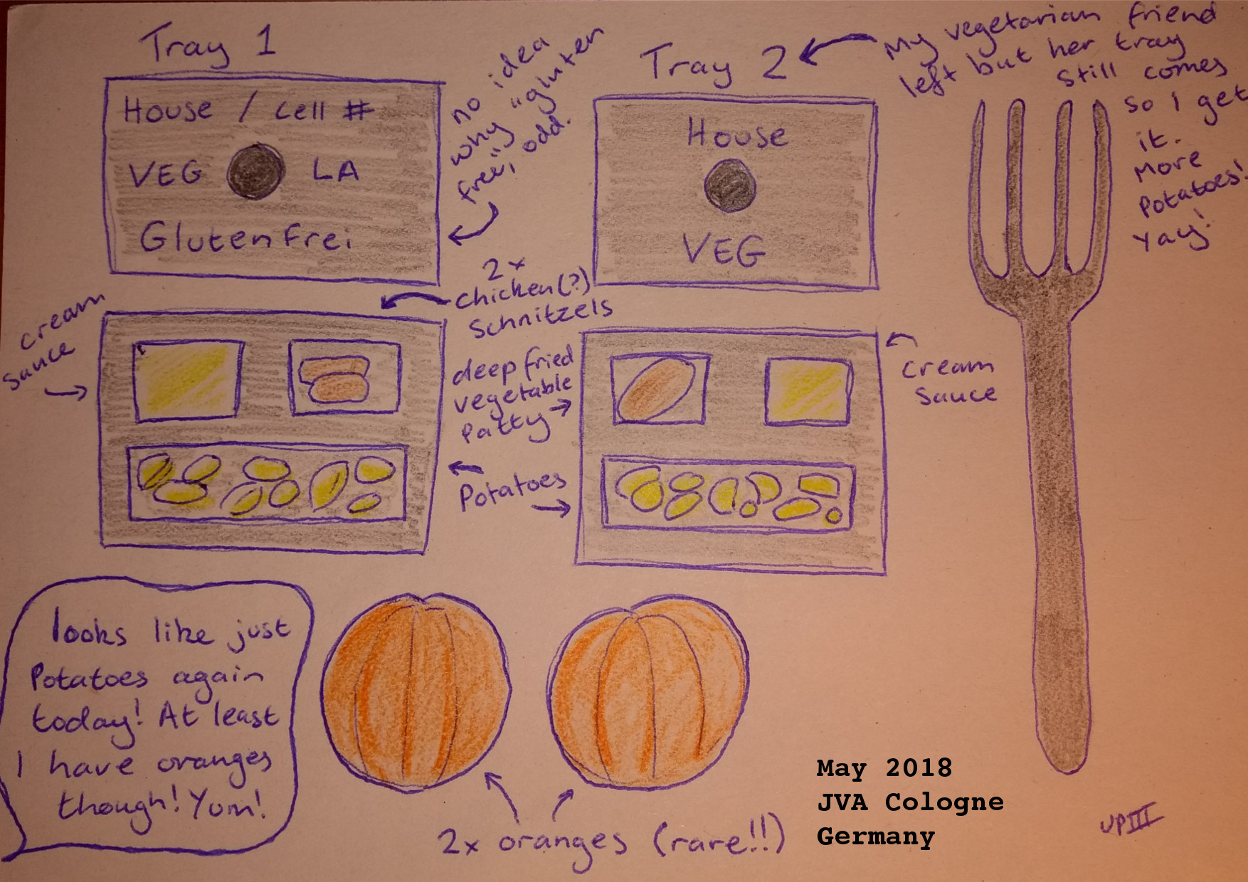 Lunch. Drawing. 5/18Note 23/5/18: I’m sure some of you reading this wonder what I eat here (and sometimes I wonder too, is that a vegetable? Bean, carrot, potato maybe? Why is the gravy more solid than jelly?). I mostly ear bread, brown or with, though in the last week there has been another bread, fermented I Think, that isn’t too bad. It’s bread for breakfast, except on Wednesdays when I might get Müsli or cornflakes. For lunch I either get potatoes or rice with a range of non vegan sides, usually with dairy and as I’m allergic this isn’t an option to eat (not that I would anyway, I’m not a calf). Some days, like today, I am lucky and may get some fruit or vegetable (thoughh maybe once or twice a week). If I’ve ordered shopping I might have chocolate. That’s pretty much it really, bread, potatoes, white rice, chocolate, maybe a fruit or vegetable. On Mondays and Saturdays we get soup, but I tend to avoid it and eat bread instead (available at breakfast and lunch). No wonder I’m putting on weight, I can’t wait to eat fruit again!! <3