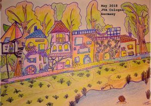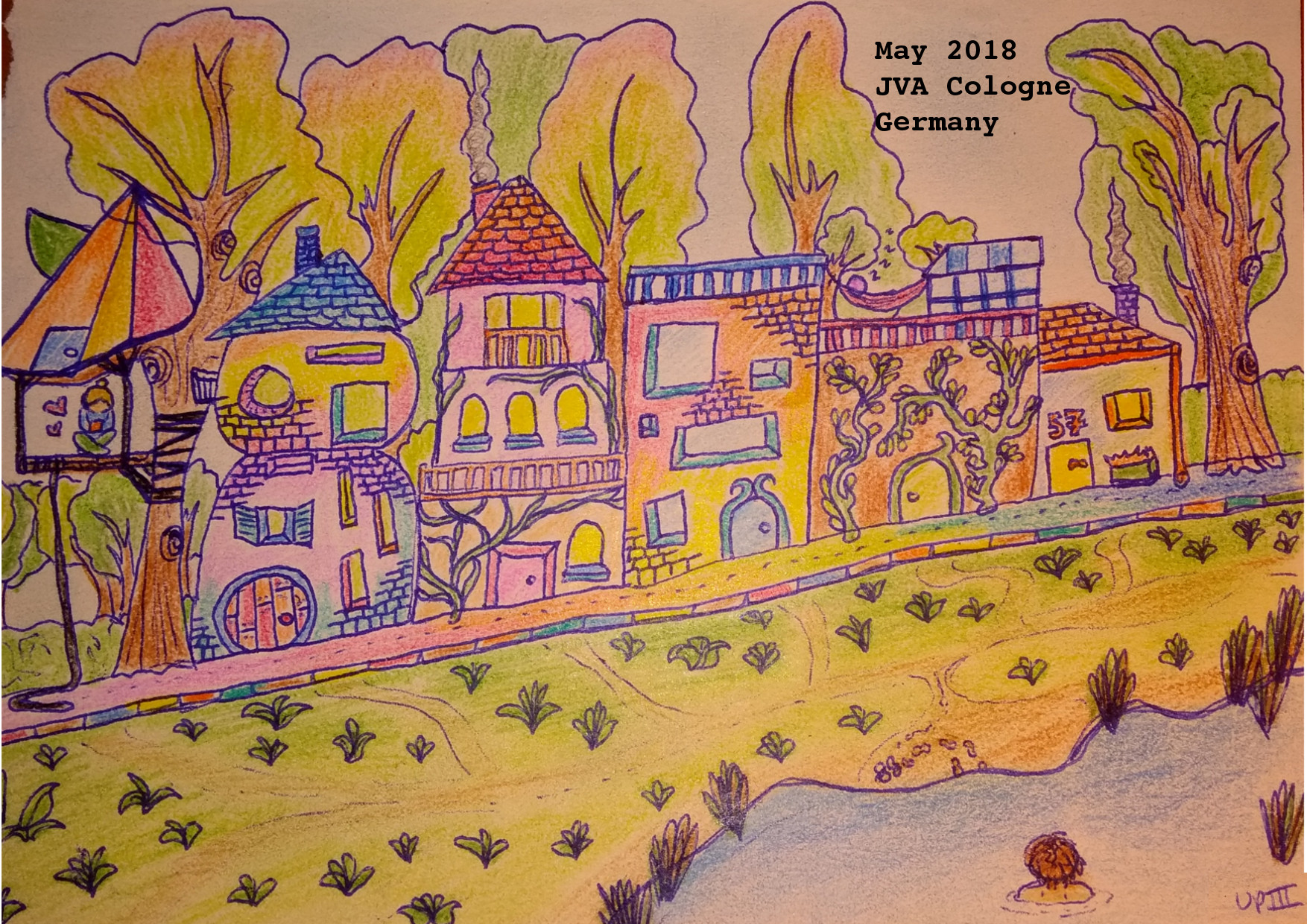 Street. Drawing. 5/18Note 23/5/18: I don’t have much to say about this one, but my drawing is slowly getting better which I’m really happy about (I always wanted to be an artist when I was “grown up” but a lot of circumstances meant I was unable to, cheers capitalism). The beds here aren’t great so my back and shoulders are often sore making it difficult to hold a pen or pencil. This means I can’t draw everyday which is greatly upsetting but maybe the breaks are good so I have more ideas of what to draw. Lately I’ve been trying to teach myself to draw eyes and faces because I struggle to draw both sides the same. I’m sending this street though because it is so colorful and energetic and I hope that it will give you strength. <3