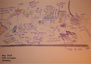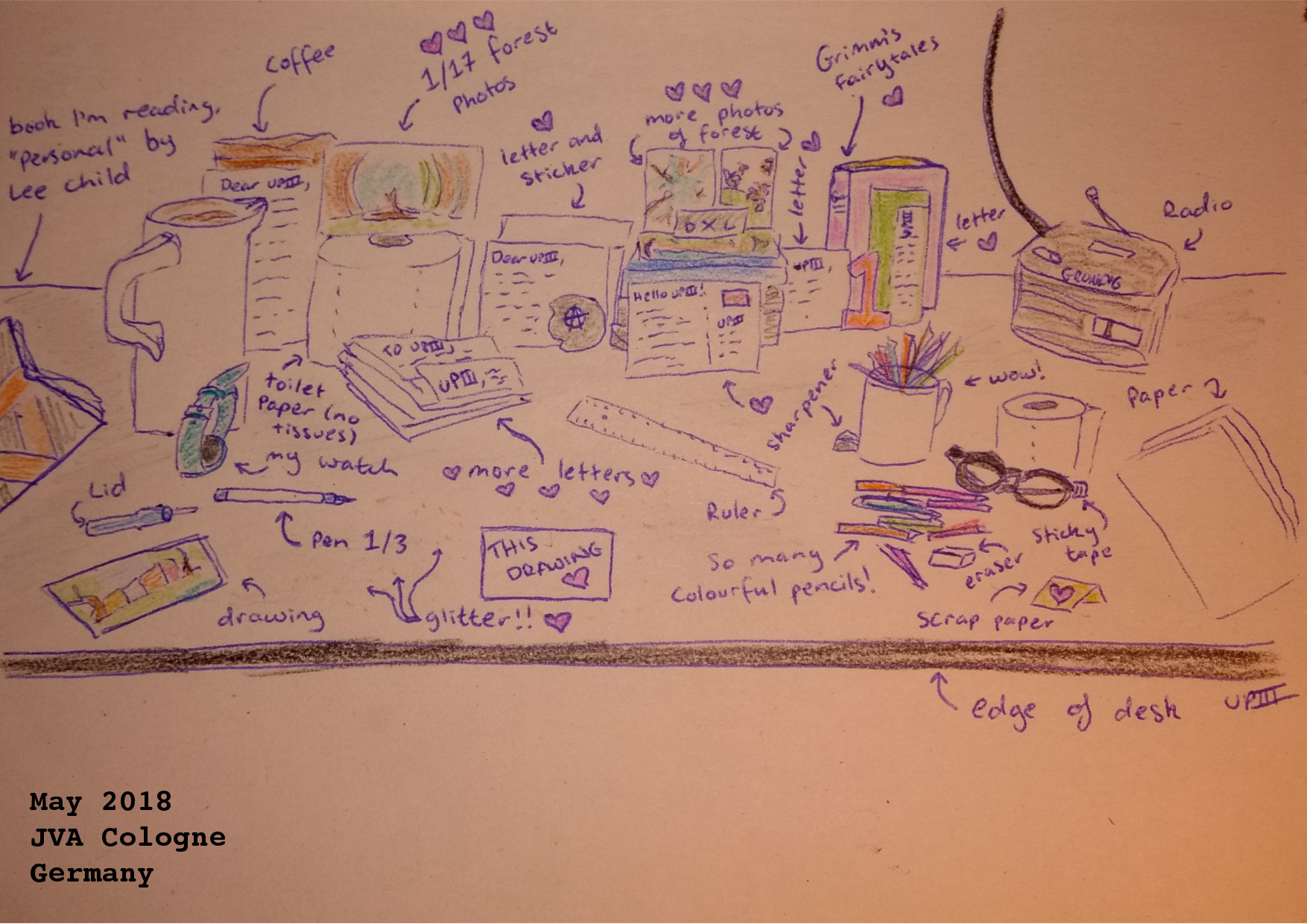 The Desk. Drawing. 5/18Note 23/5/18: This is where I spend most of my day, where I draw, read and write. I like to rearrange it every few days and wipe the desk (it gets super dusty for some reason) to get rid of prison grossness. I’ve now received seventeen letters (yay!!), six of which I was given yesterday. I’m starting to run out of place to put them all so I can just reach out and read them! I have some slingshot newspapers too (thank you!!) but I’ve leant to a friend for today because it isn’t easy to find any English books or anything here and she, like me, only speaks English. I’m also slowly running out of toilet paper because I’ve been sick and blowing my nose constantly. Not good when I only get two rolls a week!! I’ve also broken my glasses (oops) so they are being held together by sticky tape. I wish my prescription wasn’t strange, I’ll probably need another pair soon. I wonder what its like to be able to see without glasses? For me it feels like suddenly experiencing HD vision when I put them on, otherwise I just see blurred colours. For now I think I will read the letters again, because I love every single one a whole lot. <3