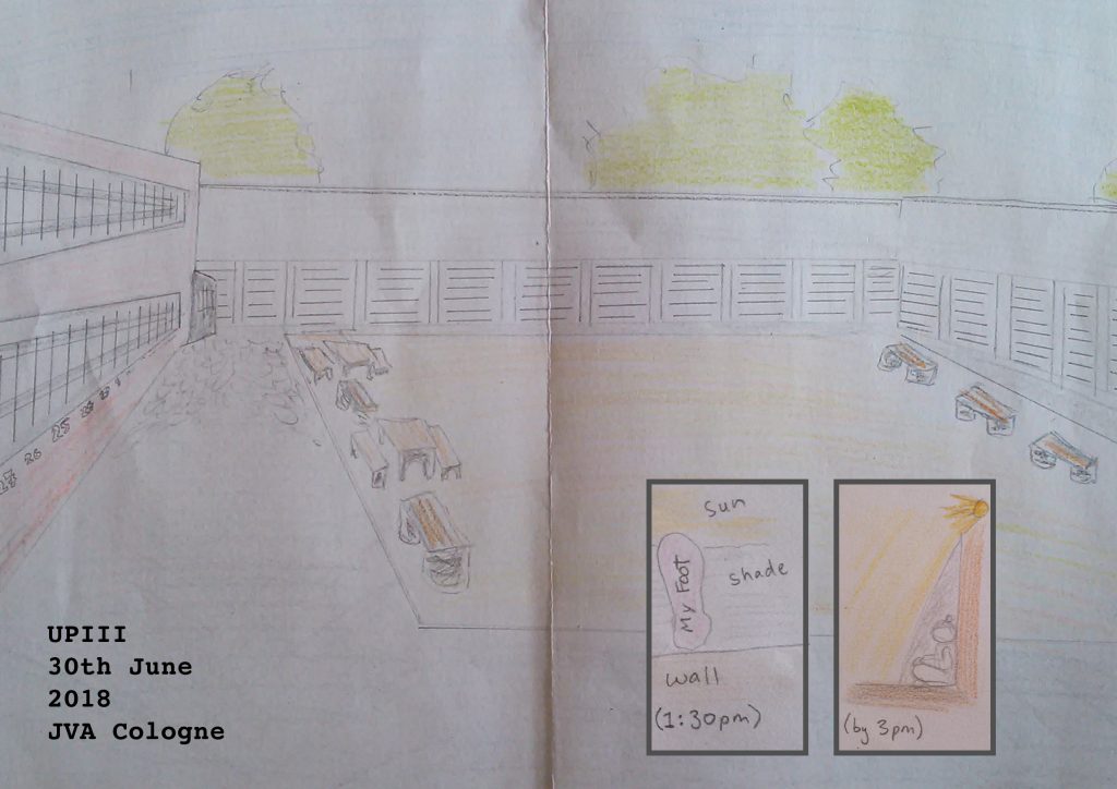 Courtyard of Haus 10 – perspective. Drawing. 30/6/18Note: It looks small here, but I think it is one of the biggest yards in the prison – 25x55m (give or take a bit, it looks roughly what I remember, a little smaller, than a large “dressage arena”) perhaps. No trees, no cover, only shaded in one spot by a nearby building. It was incredibly hot today -high twenties I think – and we were hiding in 20cm of shade, just under the length of my foot. “Freistunde” was from 1:30 – 3:00pm today (extra time was good but it was way too hot). At least by 3pm we had almost a meter of shade, enough to sit down and huddle in. I’d rather go out in the morning or maybe late afternoon. The middle of the day is awful with next to no shade :( … There’s shit missing and I “can’t talk about it”. Bu yeah, more fences.