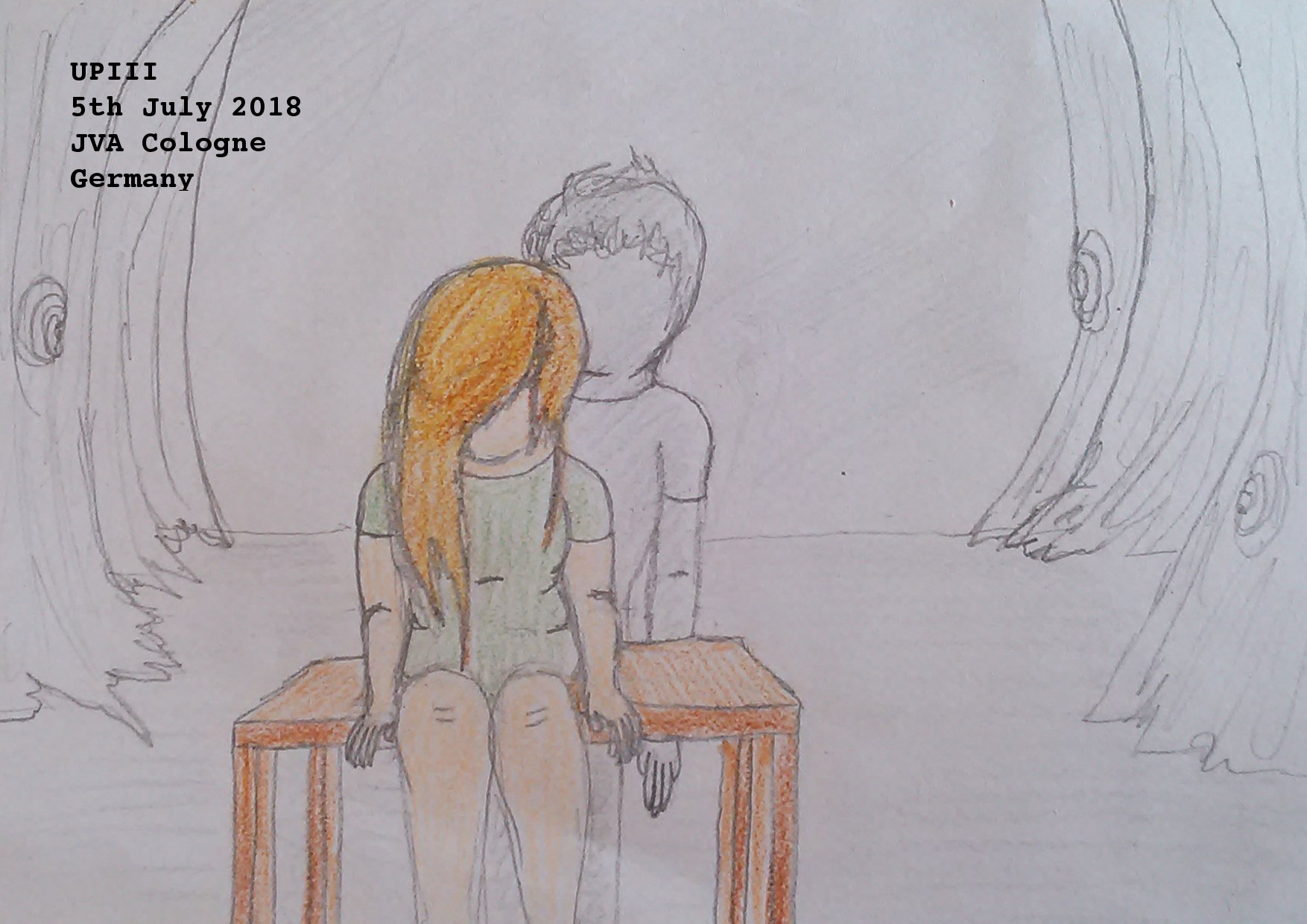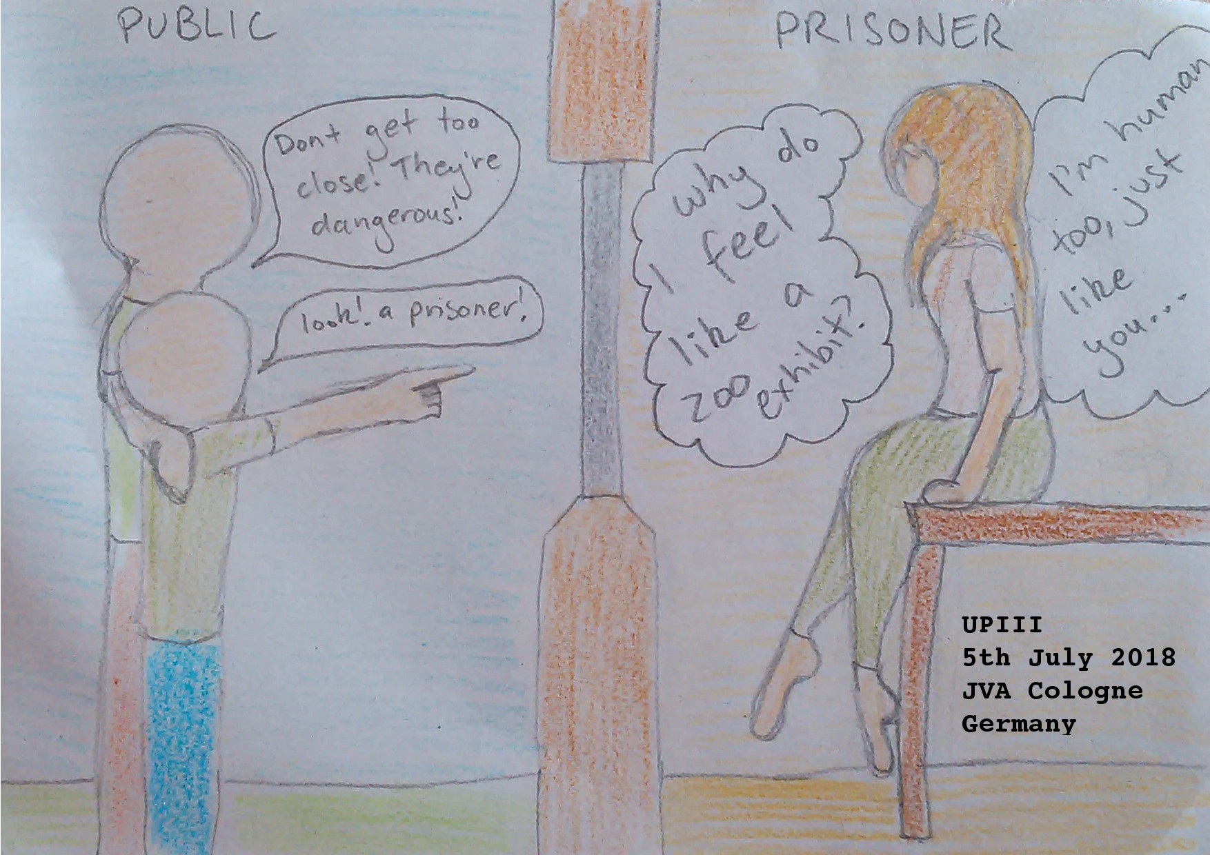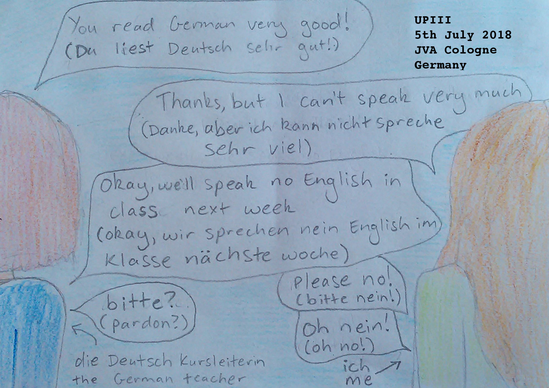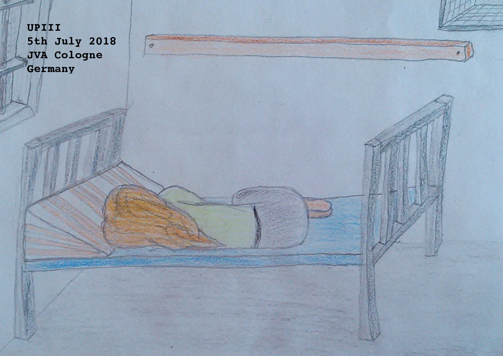 Deutschkurs/German Course. Drawing. 5/7/18Note: Ich heiße UPIII, nicht “Aussie” oder “meine fat Freundin” oder “Freund” (ich mag sie, nicht er). Oder ich will antworte nicht. Ich habe lebe im Gefängnis für drei Monate und es ist sheiß. Der “Haftsaum” ist klein, heiß und alt (bauen 1960’s, ich höre). Aber, bald, ich komme raus. I am called UPIII, not “Aussie” or “my fat friend” or “male friend” ( I like she, not he). Or I will not answer. I have lived in prison for three months, and it is shit. The “arrest room” is small, hot and old (built in 1960’s, I hear). But, soon, I come out. Note: “arrest room” is the German justice system’s way of saying “cell”. Ich hoffe das ist richtig! I hope that is right!
