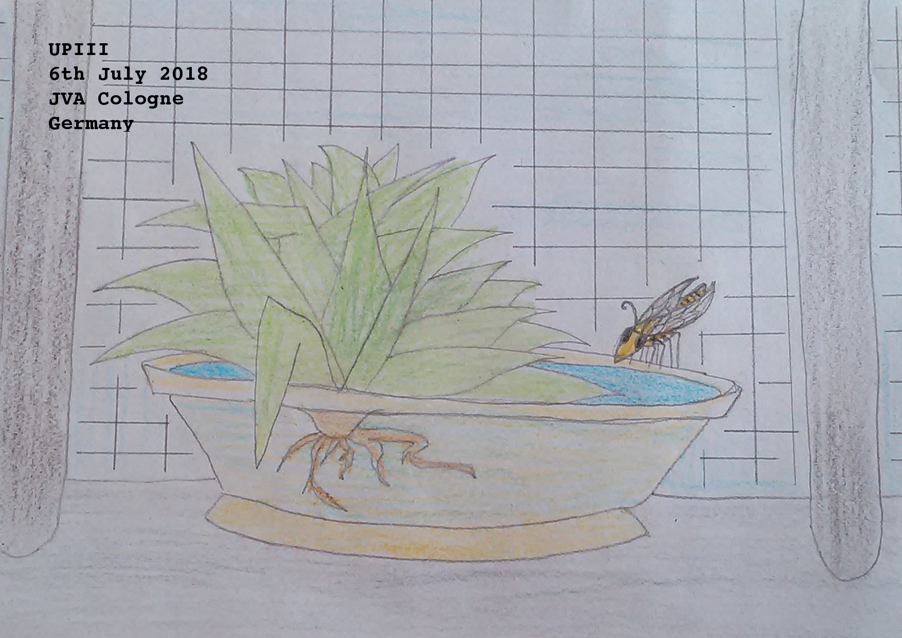 Drink station. Drawing. 6/7/18Note: The weather has been incredibly hot lately and I’ve started noticing a bunch of little insects finding their way to my window sill to drink out of the plant pots. I’ve seen bees, bumble bees, wasps and ants so far. I enjoy watching them, especially the wasps (I recognize one in particular as they prefer to drink off the sage leaves, where their friends prefer to drink straight from the water). The wasps also mike the most noise, the bees are pretty quiet in comparison. It’s interesting watching them drink too, because their whole bodies shake and vibrate. They’re very peaceful as well; all the insects just pop by, drink, and hover off again, sometimes bumping into the bars. It’s cute, like “oops! I missed the gap!”. It always makes me smile.