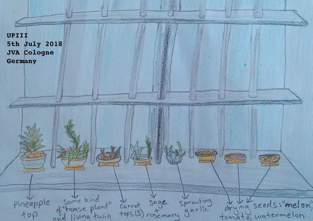The windowsill. Drawing. 5/7/18Note: This was my cell window over the weekend; the carrots, pineapple, living twig, and “melon” seeds (mixes galia and honig) are gone because they either started rotting (too hot and started “cooking” them) or shriveled up :( The garlic is the happiest, new cloves start sprouting every day or so, and I like to rub my fingers on the sage or rosemary to have something to smell that isn’t dust. Also, it’s been very hot and humid for days (it feels like I live in a sauna…) so my remaining potatoes, garlic and ginger have all started sprouting green shoots (!!!). I wish I had somewhere to plant them.