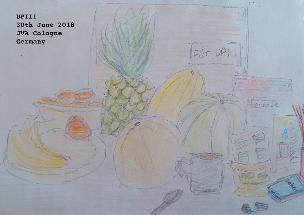 Desk. Drawing. 30/6/18 – morning, 11:30amNote: This is the corner of my desk (closest to the door) right now. There’s three melons – water melon, honey melon and something that I’ve never seen before called “galianmelone” in German. Continue reading Letter #21 from UPIII