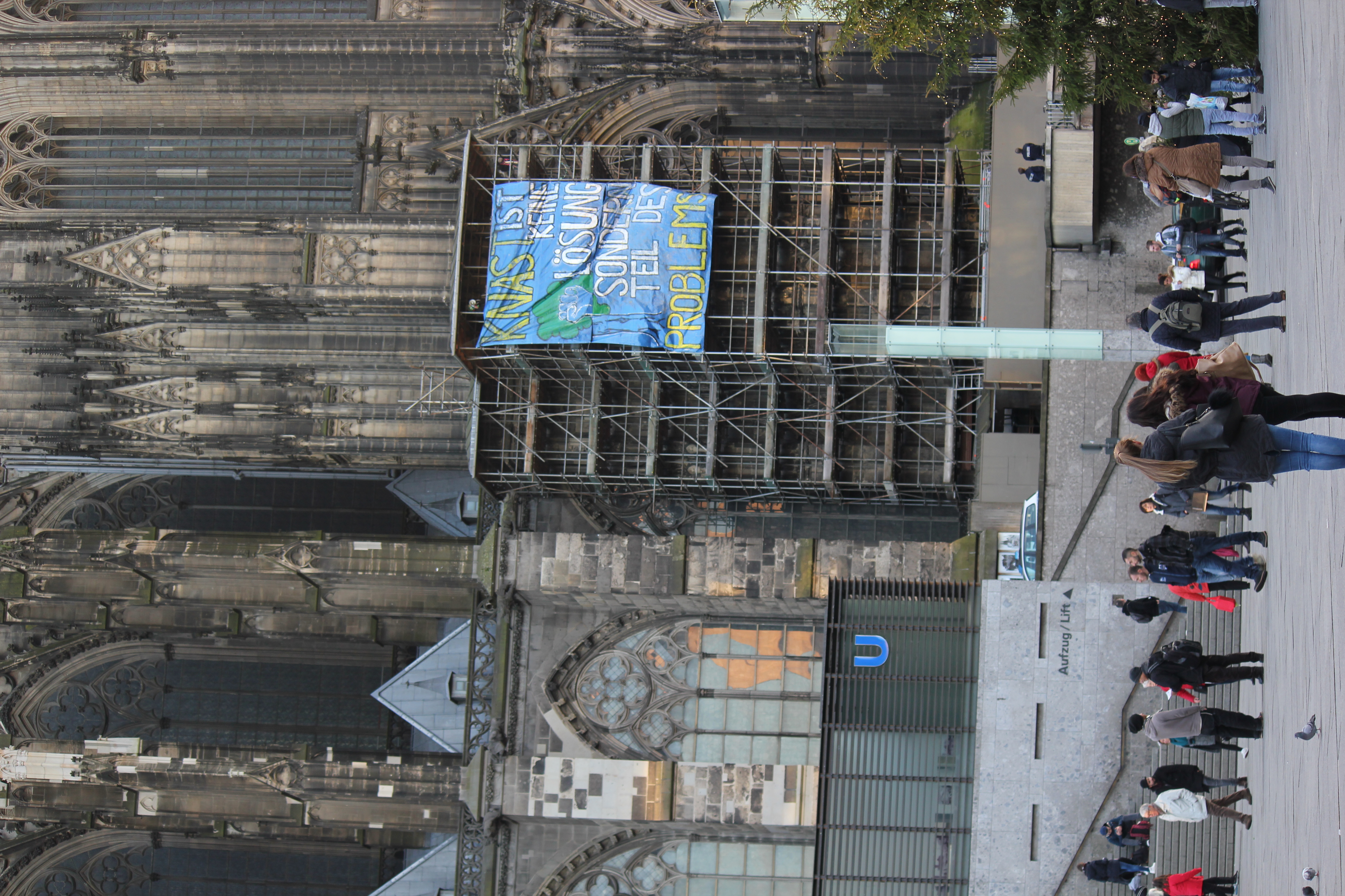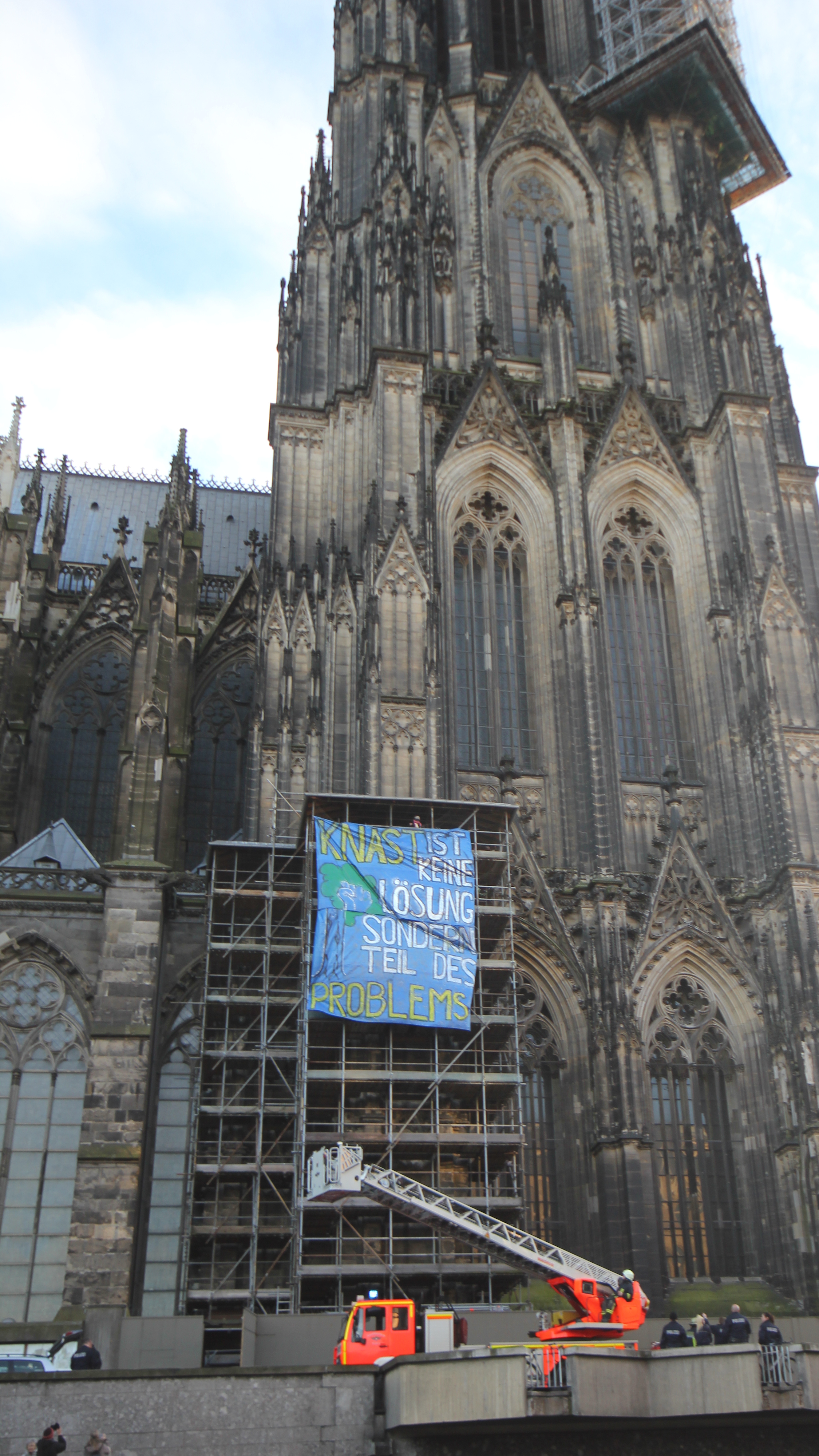 Knast ist keine Lösung sondern Teil des Problems! Am 23. November um 15:00 Uhr haben wir die Außenseite des Kölner Dom erklettert und ein Transparent aufgehängt. Angesichts der derzeitigen Repression und Gewalt gegen Umweltaktivist_innen aus dem Hambacher Forst, haben wir uns dazu entschieden durch eine direkte Aktion auf die derzeitige Situation aufmerksam zu machen. Continue reading Aktionserklärung / Action Declaration zur Dom-Besetzung