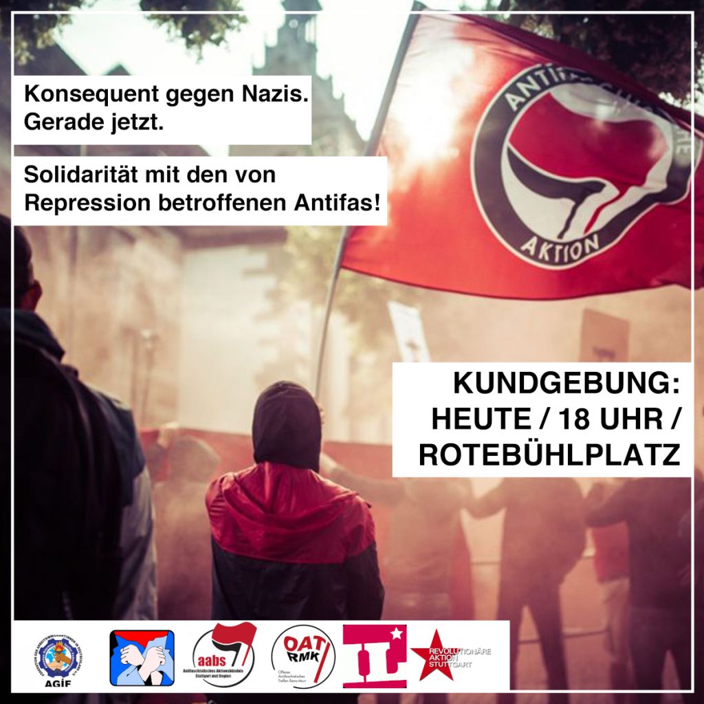 Heute Morgen wurden von mehreren hundert Polizist*innen in sieben Städten Wohnungen von neun Antifaschist*innen durchsucht. Hintergrund war ein Angriff auf einen rechten Betriebsrat bei einer Corona Demo in Stuttgart Mitte Mai. Eine Person wurde wegen einem Haftbefehl wegen versuchtem Totschlag in U-Haft gesteckt.