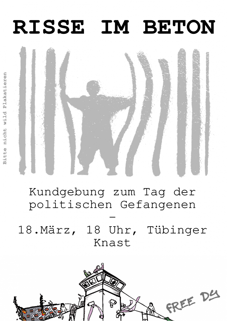 Zwei Tage nach der Kundgebung in Tübingen, am 20. März 2021, findet in Stuttgart eine überregionale Demonstration in Solidarität mit den Antifaschist:innen Lina, Jo & Dy statt. Beginn ist um 14 Uhr am Hauptbahnhof. Die Demo richtet sich gegen die staatlichen Angriffe auf die antifaschistische Bewegung im Generellen und steht auch im Kontext des Tags der politischen Gefangenen. Zur gemeinsamen Anreise aus Tübingen treffen wir uns um 12:45 Uhr am Bahnhof. Unsere Aktion am 18. März sehen wir als Ergänzung dazu und als Zeichen der Solidarität hier in Tübingen.