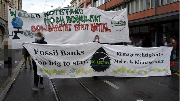 Das derzeitige Investitionsverhalten der globalen Finanzmärkte befördert eine weltweite Erwärmung von rund 4 bis 6 Grad. Daher fanden die Aktionstage des Collective Climate Justice in Basel und Zürich 2019 unter dem Motto „Fossil Banks too big to stay“ statt.