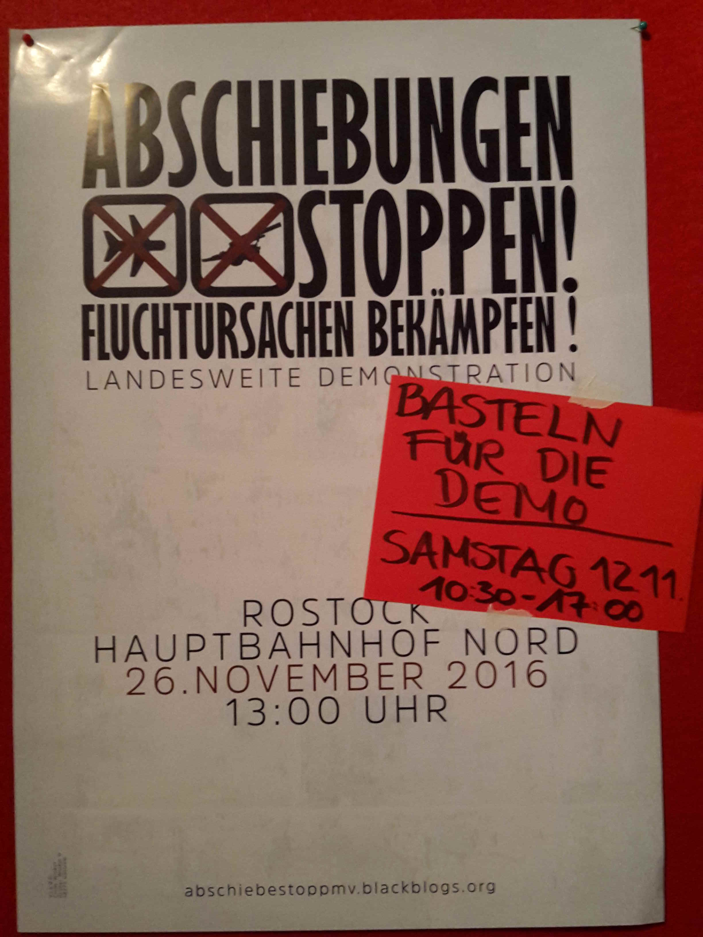 Vor einem Jahr flohen zahlreiche Menschen aus Kriegs- und Krisenregionen in Vorderasien und Afrika. Tausende passierten auch den Rostocker Bahnhof. Das daraufhin gegründete Bündnis „Rostock hilft!“ mobilisierte unzählige Rostocker_innen welche den Ankommenden halfen Unterkunft und Orientierung zu finden und sie mit dem Notwendigsten versorgten. Viele Geflüchtete machten sich weiter auf den Weg vom Fährhafen nach Skandinavien. Nun sollen sie und zahlreiche weitere Schutzsuchende abgeschoben werden, zurück in Krisenregionen oder Erstaufnahmeländern.