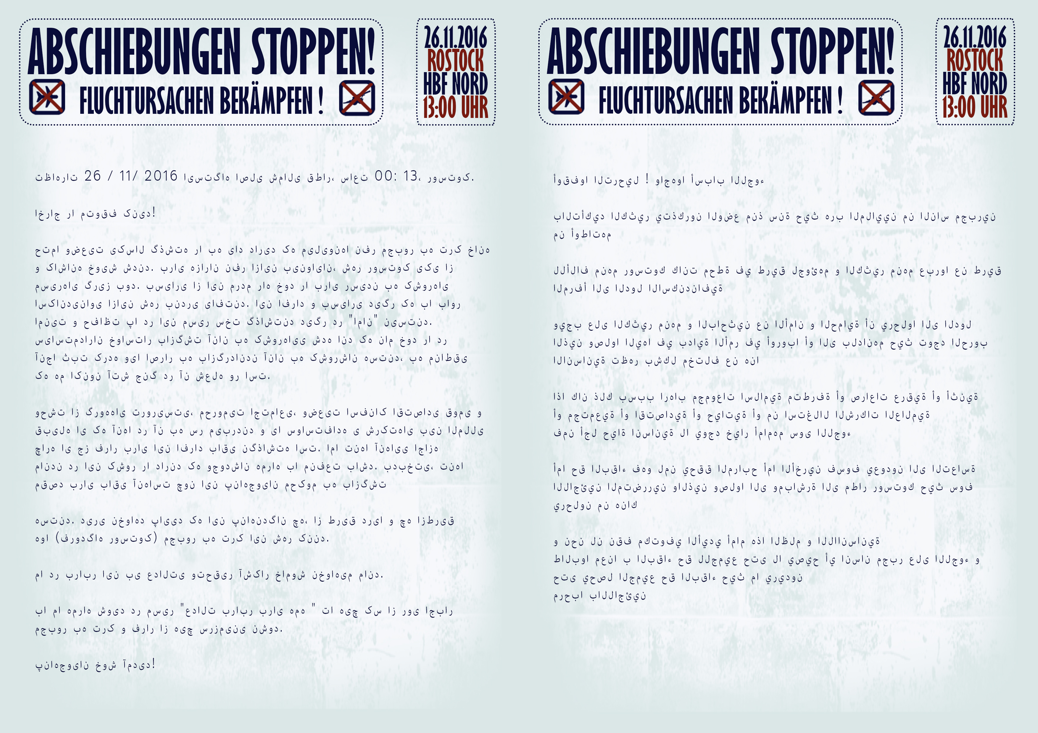 Wir haben unseren Kurzaufruf vom Flyer in mehrere Sprachen übersetzen lassen. Ihr findet ihn unter der Rubrik Texte in Arabisch, Englisch, Farsi und Französisch.