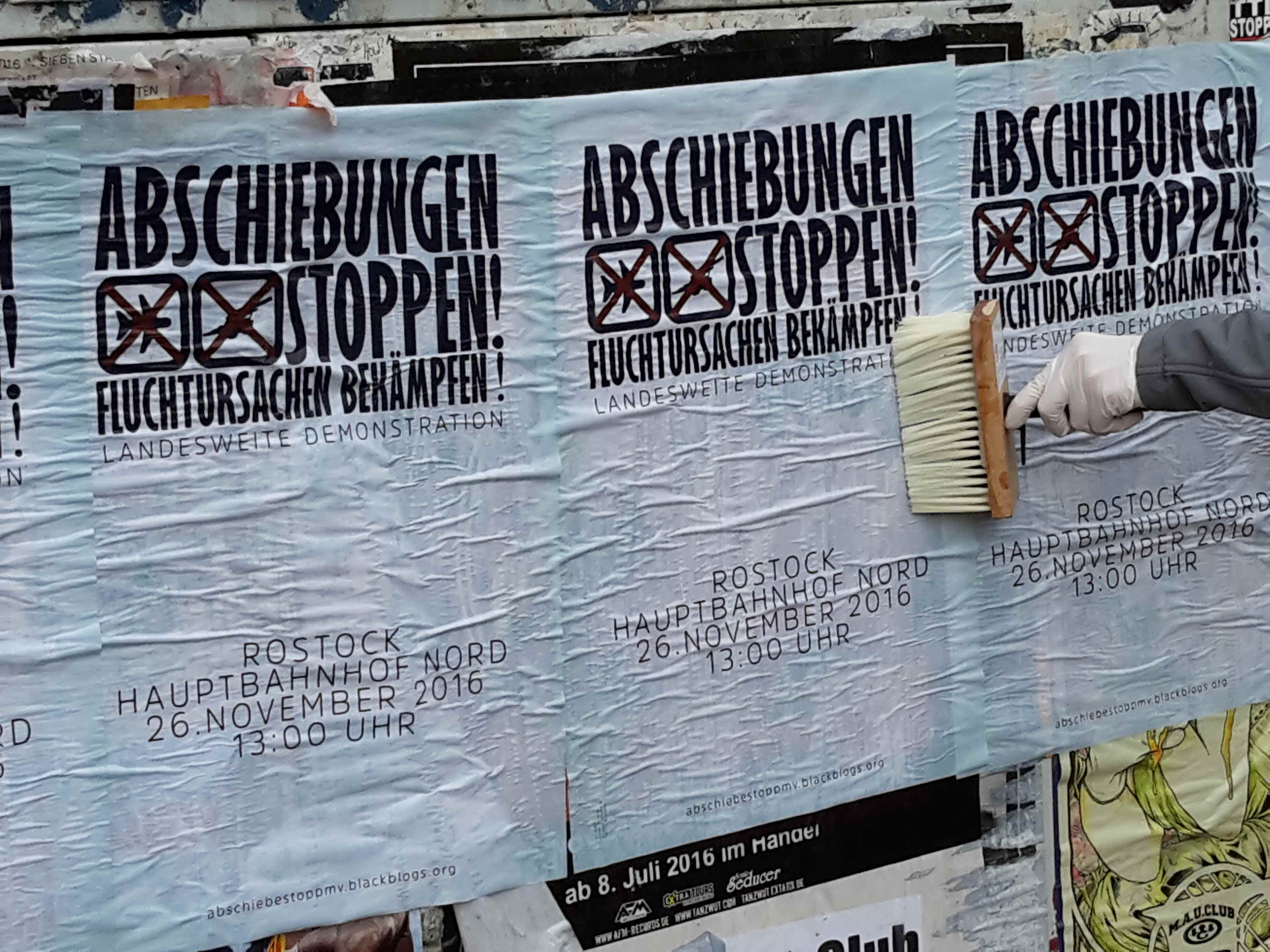 Heute wurden zahlreiche Demo-Plakate in Rostock verklebt. In den kommenden Tagen werden noch weitere folgen. Die Layouts von Flyern und Plakaten haben wir online gestellt. Unter der Rubrik Material könnt ihr sie anschauen und zum Verfielfältigen runterladen. In den nächsten Tagen werden wir noch Texte, eine Pressemitteilung und einen Flyertext in Englisch, Französisch, Farsi und Arabisch online stellen. In den letzten Tagen war viel los in Rostock. Solidaritätsaktionen und Proteste gegen den voranschreitenden Faschismus in der Türkei und die Inhaftierung der HDP-Abgeordneten haben uns in Atem gehalten. Wir arbeiten aber weiter auf eine starke Demonstration am 26.11. hin!