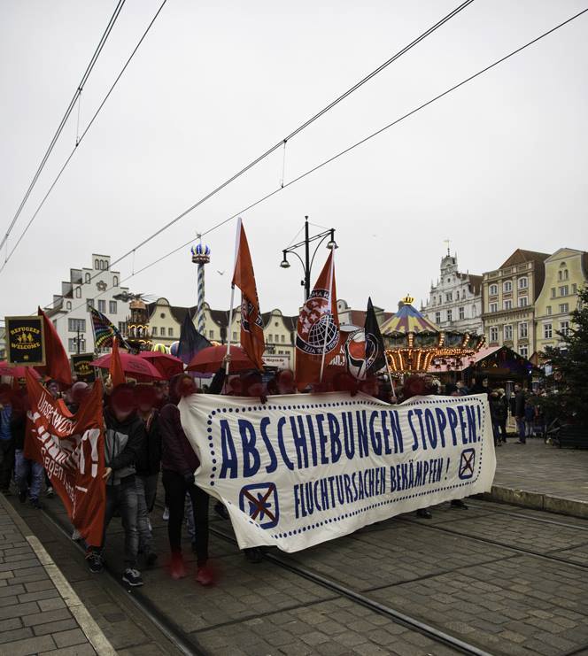 Etwa 400 Menschen demonstrierten am Samstag in Rostock gegen Abschiebungen und Fluchtursachen. Die Demonstration zog entlang des Weihnachtsmarktes. Während des Aufzuges blieb es ruhig. Der Demo vorausgegangen war eine mehrwöchige Kampagne zur Thematisierung der massiven Abschiebungen aus M-V und der Ursachen von Flucht.